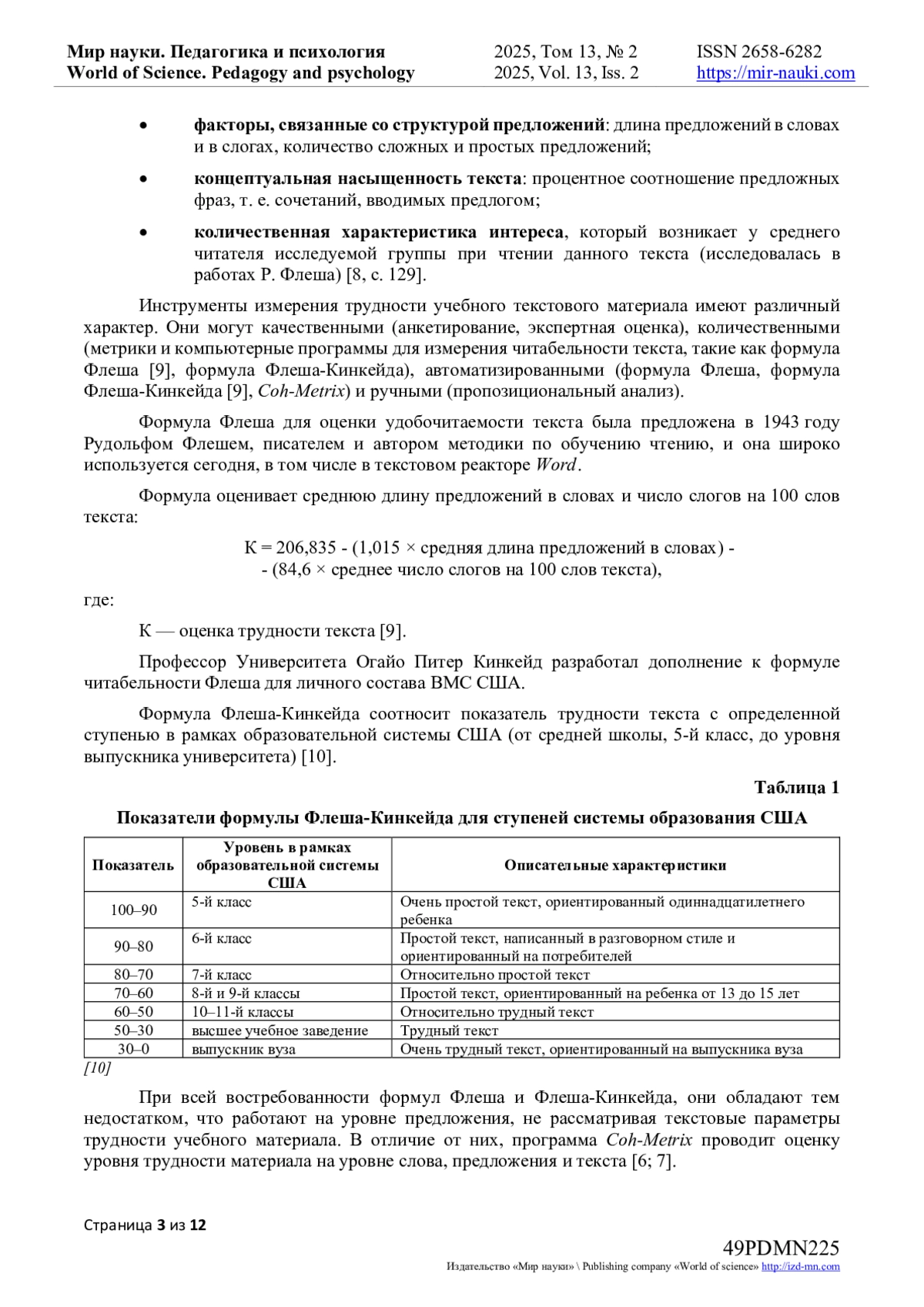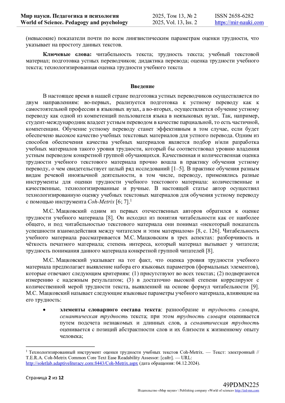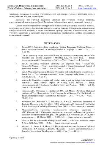 6. Graesser, A.C., McNamara D., Kulikowich J.M. Coh-Metrix: Providing Multilevel Analyses of Text Characteristics / A.C. Graesser, D. McNamara, J.M. Kulikowich. - Текст: непосредственный // Educational Researcher. - 2011. - Vol. 40. - No. 5. - PP. 223-234.