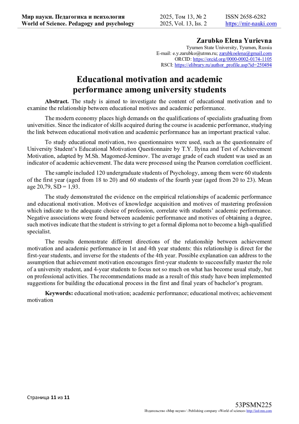 В статье исследуется содержание учебной мотивации, изучается связь между учебными мотивами и академической успеваемостью. Современная экономика предъявляет высокие требования к квалификации специалистов, выпускаемых университетами. Поскольку показателем усвоенных в ходе обучения знаний является академическая успеваемость, изучение связи учебной мотивации и успеваемости студентов имеет важное прикладное значение. Для изучения учебной мотивации использовалась методика «Мотивация обучения в ВУЗе» Т. И. Ильиной и методика «Диагностика мотивации достижения» М. Ш. Магомед-Эминова. В качестве показателя академической успеваемости использовался средний балл успеваемости каждого студента. Метод обработки: критерий корреляции Пирсона. Выборку составили 120 студентов бакалавриата направления «Психология», из них 60 студентов 1 курса от 18 до 20 лет и 60 студентов 4 курса от 20 до 23 лет. Средний возраст 20,79 лет (SD = 1,93). Выявлено, что академическая успеваемость студентов связана с учебной мотивацией. Успеваемость напрямую связана с мотивами приобретения знаний и овладения профессией, актуализация которых указывает на адекватный выбор профессии. Успеваемость обратно связана с мотивом получения диплома, актуализация которого указывает, что обучение осуществляется ради получения формального документа о высшем образовании. Выявлены разные направления связи между мотивацией достижения и успеваемостью у студентов 1 и 4 курса: у первокурсников эта связь прямая, у студентов 4 курса обратная. Вероятно, мотивация достижения побуждает первокурсников успешно освоить роль студента, а студентов 4 курса - ориентироваться не столько на ставшую привычной учебу, сколько на профессиональную деятельность. На основе полученных результатов делаются рекомендации о построении учебного процесса на первом и выпускном курсе бакалавриата.