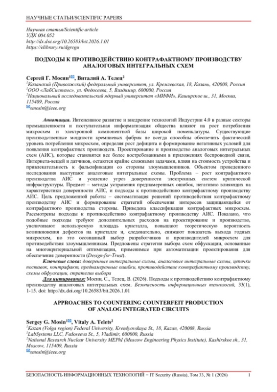 Интенсивное развитие и внедрение технологий Индустрии 4.0 в разные секторы промышленности и поступательная информатизация общества влияют на рост потребления микросхем и электронной компонентной базы широкой номенклатуры. Существующие производственные мощности кремниевых фабрик не всегда способны обеспечить фактический уровень потребления микросхем, определяя рост дефицита и формирование негативных условий для появления контрафактных производств. Проектирование и производство аналоговых интегральных схем (АИС), которые становятся все более востребованными в приложениях беспроводной связи, Интернета-вещей и датчиков, остаются крайне сложными задачами, влияя на стоимость устройства и привлекательность к фальсификации со стороны злоумышленников. Объектом проведенного исследования выступают аналоговые интегральные схемы. Проблема – рост контрафактного производства АИС и усиление угроз доверенности электронных систем критической инфраструктуры. Предмет – методы устранения преднамеренных ошибок, негативно влияющих на характеристики доверенности АИС, и подходы к противодействию контрафактному производству АИС. Цель предложенной работы – систематизация решений противодействия контрафактному производству АИС и формирование стратегий обеспечения интересов защищающейся от контрафактного производства стороны. Приведена классификация контрафактных микросхем. Рассмотрены подходы к противодействию контрафактному производству АИС. Показано, что подобные подходы требуют дополнительных расходов на проектирование и производство, увеличивают используемую площадь кристалла, повышают теоретическую вероятность возникновения дефектов на кристалле и, следовательно, снижают показатель выхода годных микросхем, но это осознанный выбор разработчиков и производителей микросхем для противодействия злоумышленникам. Предложены стратегии выбора схем обфускации, основанные на многокритериальной оптимизации, применимые при автоматизации проектирования для обеспечения доверенности (Design-for-Trust).