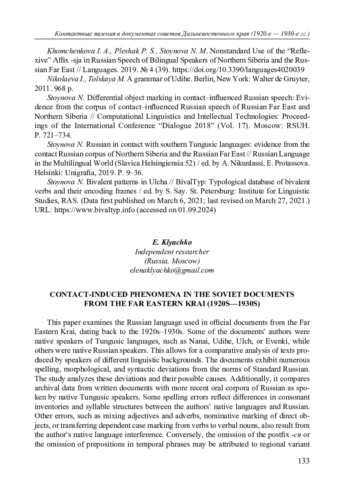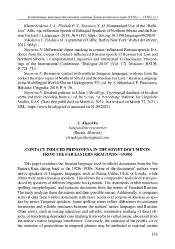 19. Khomchenkova I. A., Pleshak P. S., Stoynova N. M. Nonstandard Use of the “Reflexive” Affix -sja in Russian Speech of Bilingual Speakers of Northern Siberia and the Russian Far East // Languages. 2019. № 4 (39). DOI: 10.3390/languages4020039