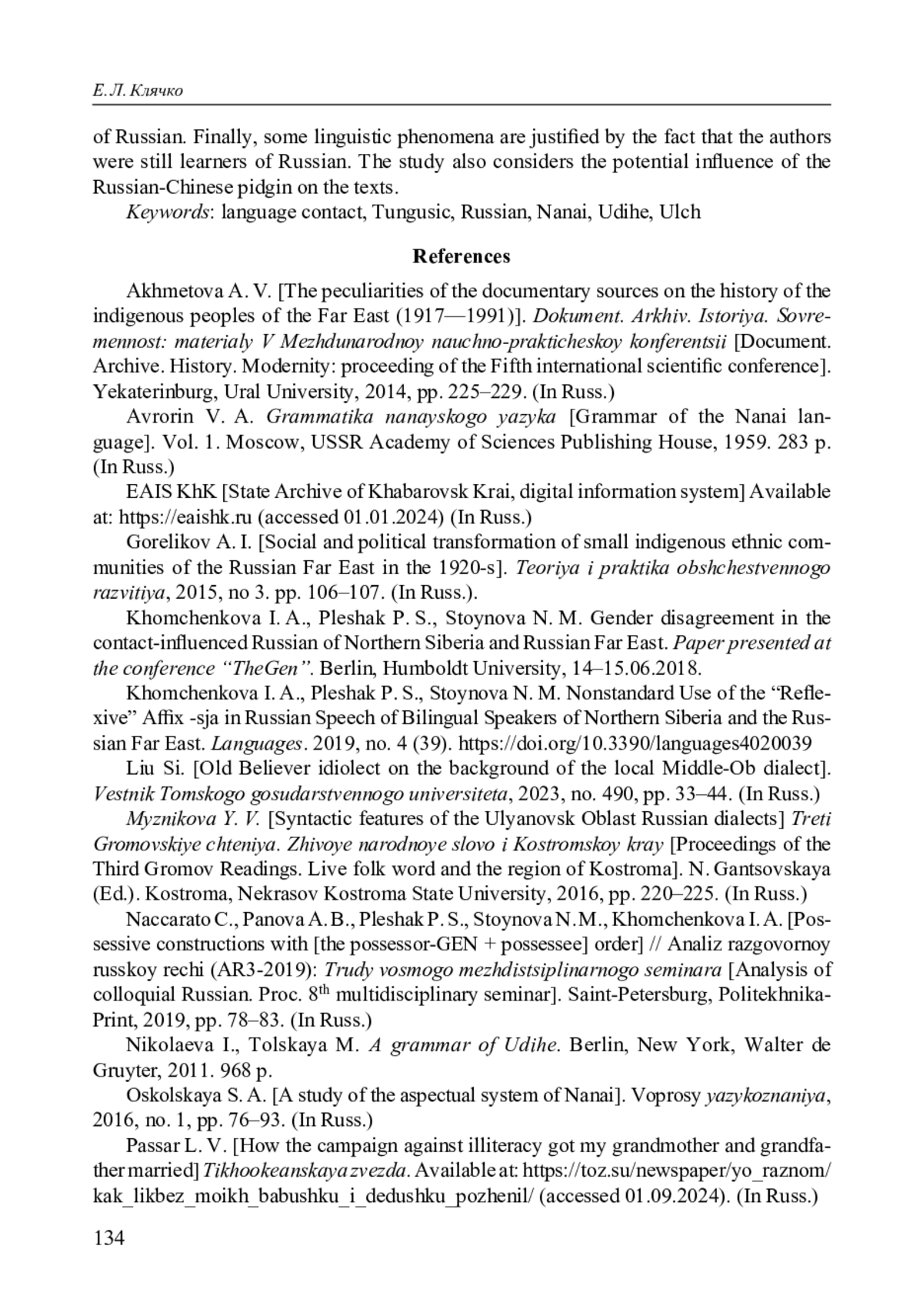 18. Khomchenkova I. A., Pleshak P. S., Stoynova N. M. Gender disagreement in the contact-influenced Russian of Northern Siberia and Russian Far East // Paper presented at the conference “TheGen”. Berlin: Humboldt University, 14-15.06.2018.