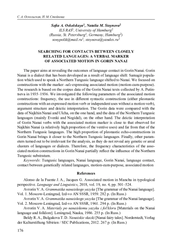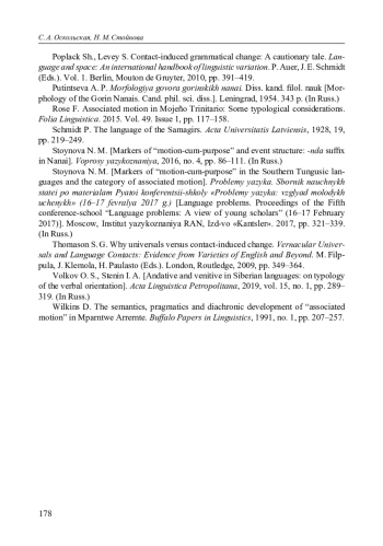 8. Стойнова Н. М. Показатели движения с целью в южнотунгусских языках и категория associated motion // Проблемы языка. Сборник научных статей по материалам Пятой конференции-школы “Проблемы языка: взгляд молодых ученых” (16-17 февраля 2017 г.) / отв. ред. Е. М. Девяткина. М.: Институт языкознания РАН, Изд-во “Канцлер”. 2017. C. 321-339. EDN: AOMLRG