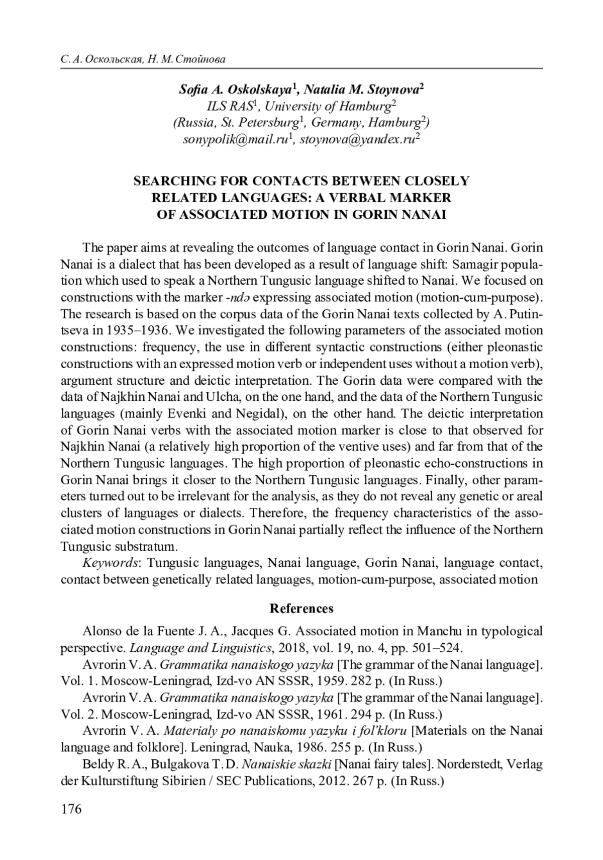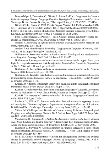 25. Pakendorf B., Stoynova N. Associated motion in Tungusic languages: a case of mixed argument structure // Associated motion / ed. by A. Guillaume, H. Koch. Berlin: Mouton de Gruyter, 2021. P. 855-897. EDN: IXRASS