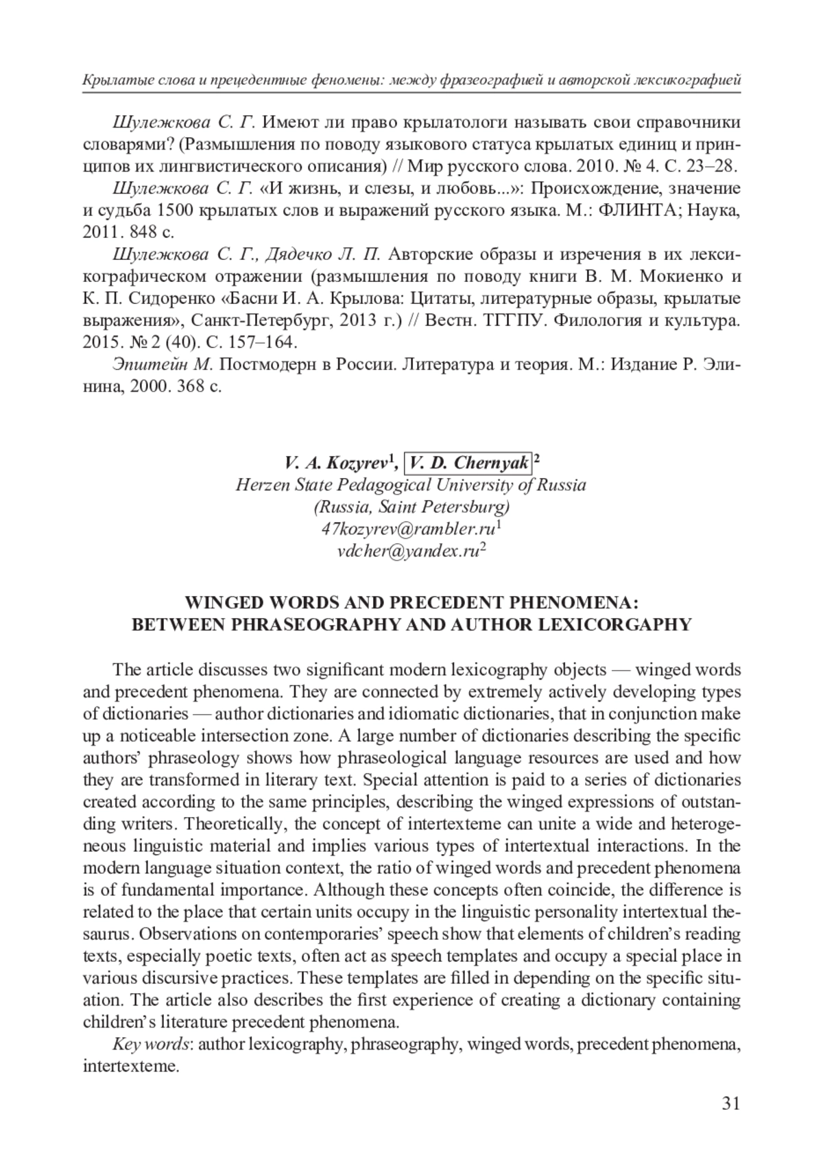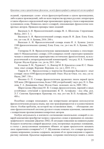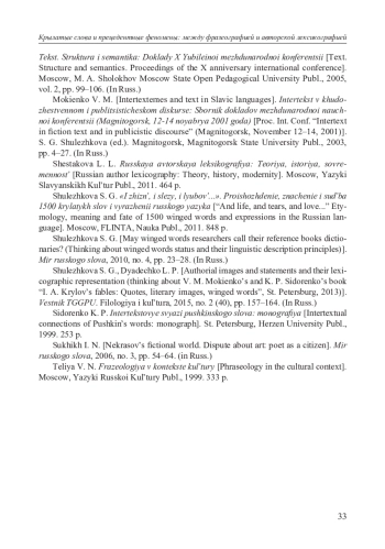 19. Шулежкова С. Г., Дядечко Л. П. Авторские образы и изречения в их лексикографическом отражении (размышления по поводу книги В. М. Мокиенко и К. П. Сидоренко “Басни И. А. Крылова: Цитаты, литературные образы, крылатые выражения”, Санкт-Петербург, 2013 г.) // Вестн. ТГГПУ. Филология и культура. 2015. № 2 (40). С. 157-164. EDN: TUIMGJ