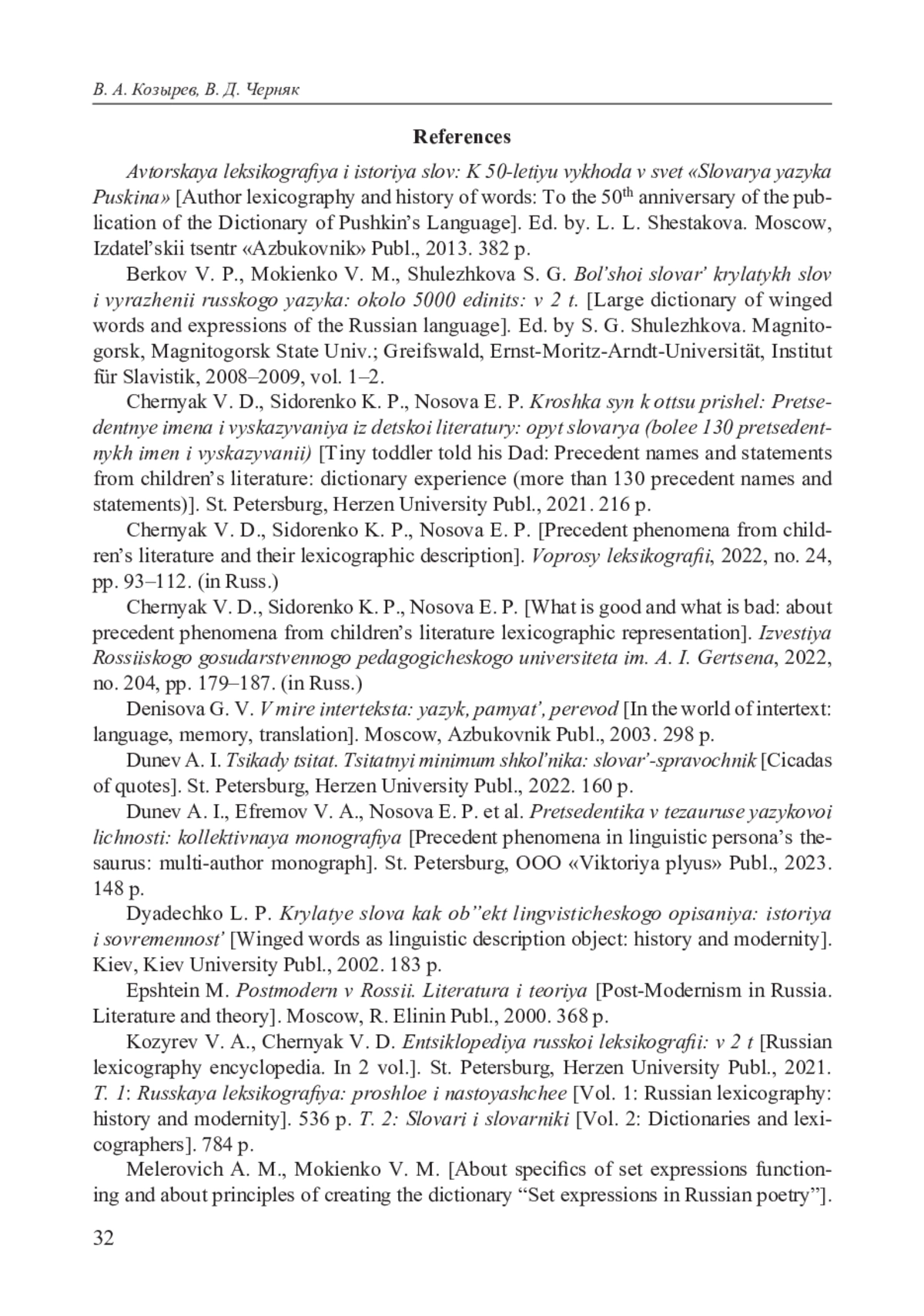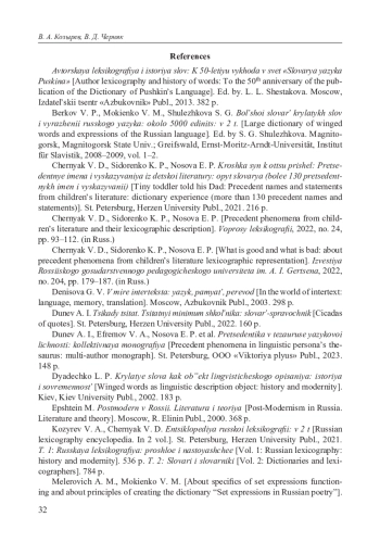 13. Черняк В. Д., Сидоренко К. П., Носова Е. П. Крошка сын к отцу пришел: Прецедентные имена и высказывания из детской литературы: опыт словаря: [более 130 прецедентных имен и высказываний]. СПб.: Изд-во Рос. гос. пед. ун-та им. А. И. Герцена, 2021. 216 с. EDN: TMLELR