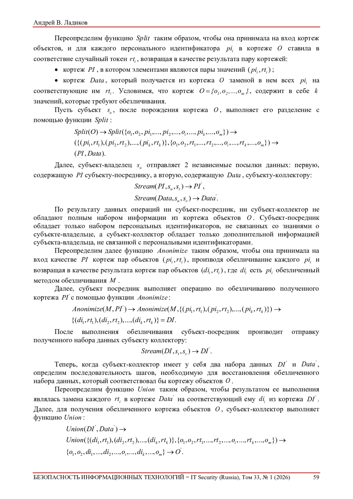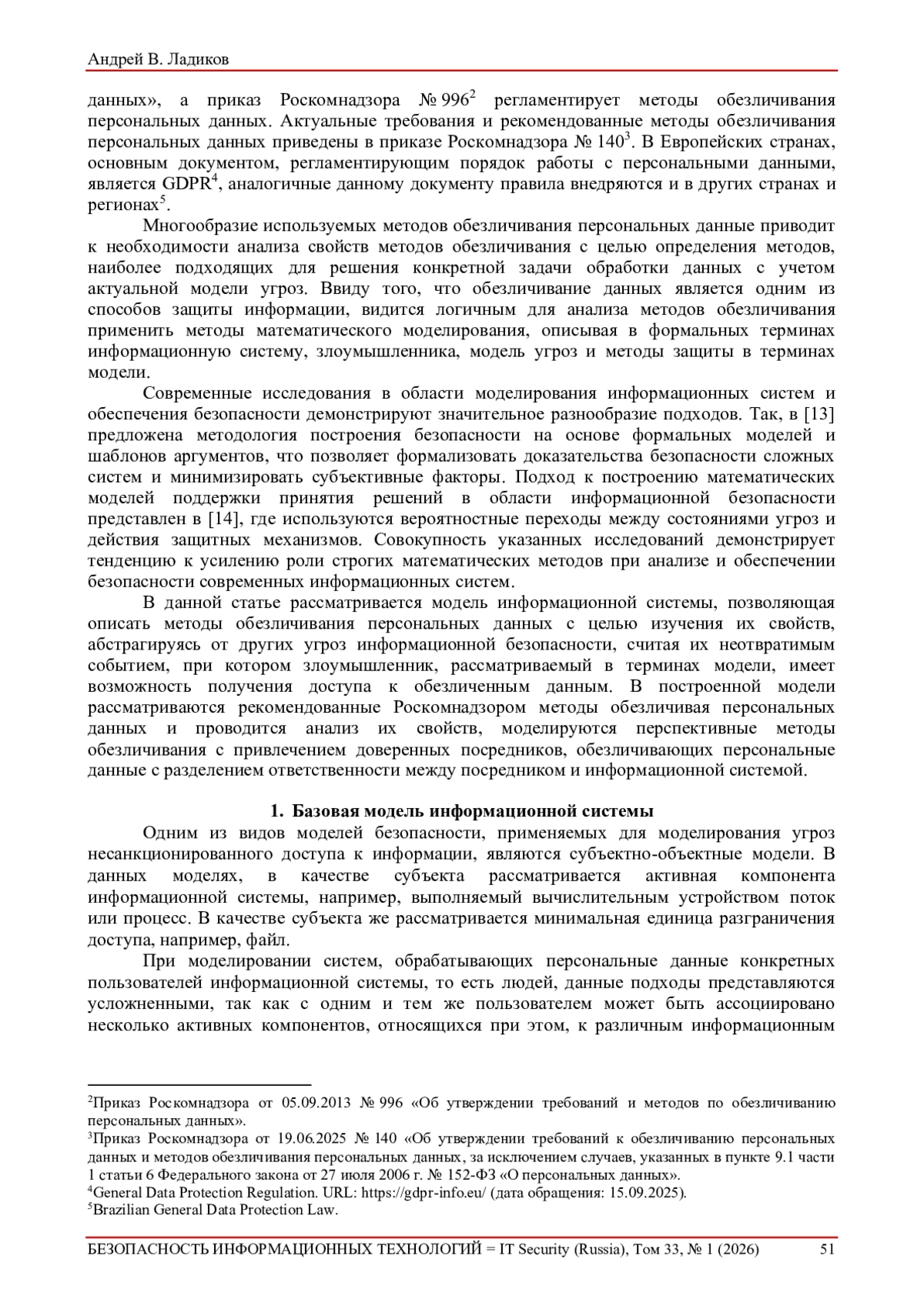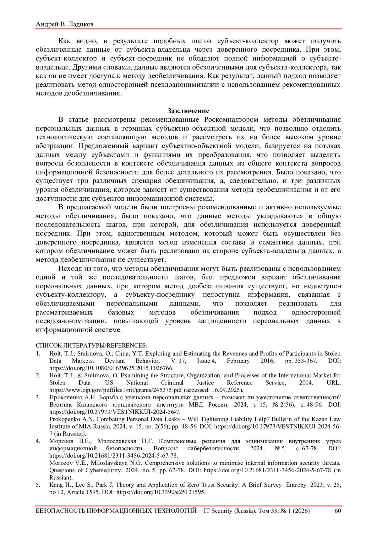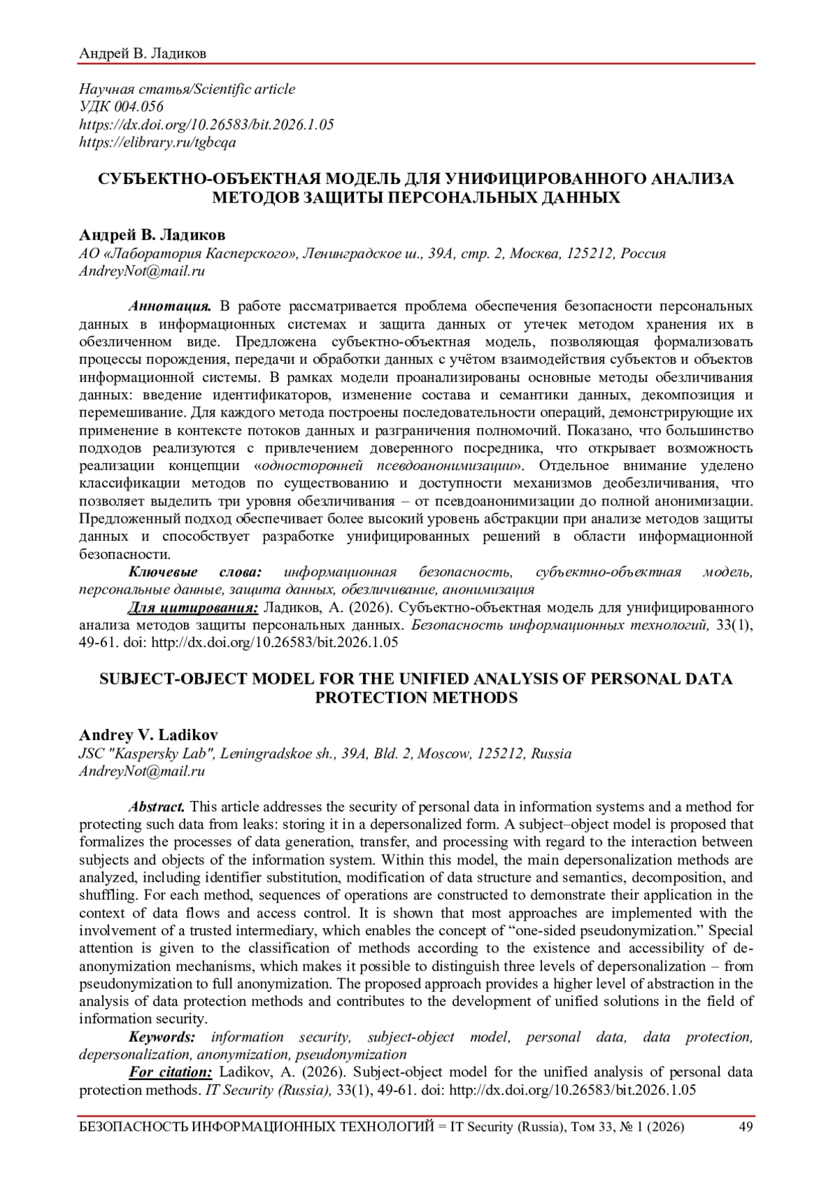 В работе рассматривается проблема обеспечения безопасности персональных данных в информационных системах и защита данных от утечек методом хранения их в обезличенном виде. Предложена субъектно-объектная модель, позволяющая формализовать процессы порождения, передачи и обработки данных с учётом взаимодействия субъектов и объектов информационной системы. В рамках модели проанализированы основные методы обезличивания данных: введение идентификаторов, изменение состава и семантики данных, декомпозиция и перемешивание. Для каждого метода построены последовательности операций, демонстрирующие их применение в контексте потоков данных и разграничения полномочий. Показано, что большинство подходов реализуются с привлечением доверенного посредника, что открывает возможность реализации концепции «односторонней псевдоанонимизации». Отдельное внимание уделено классификации методов по существованию и доступности механизмов деобезличивания, что позволяет выделить три уровня обезличивания – от псевдоанонимизации до полной анонимизации. Предложенный подход обеспечивает более высокий уровень абстракции при анализе методов защиты данных и способствует разработке унифицированных решений в области информационной безопасности.