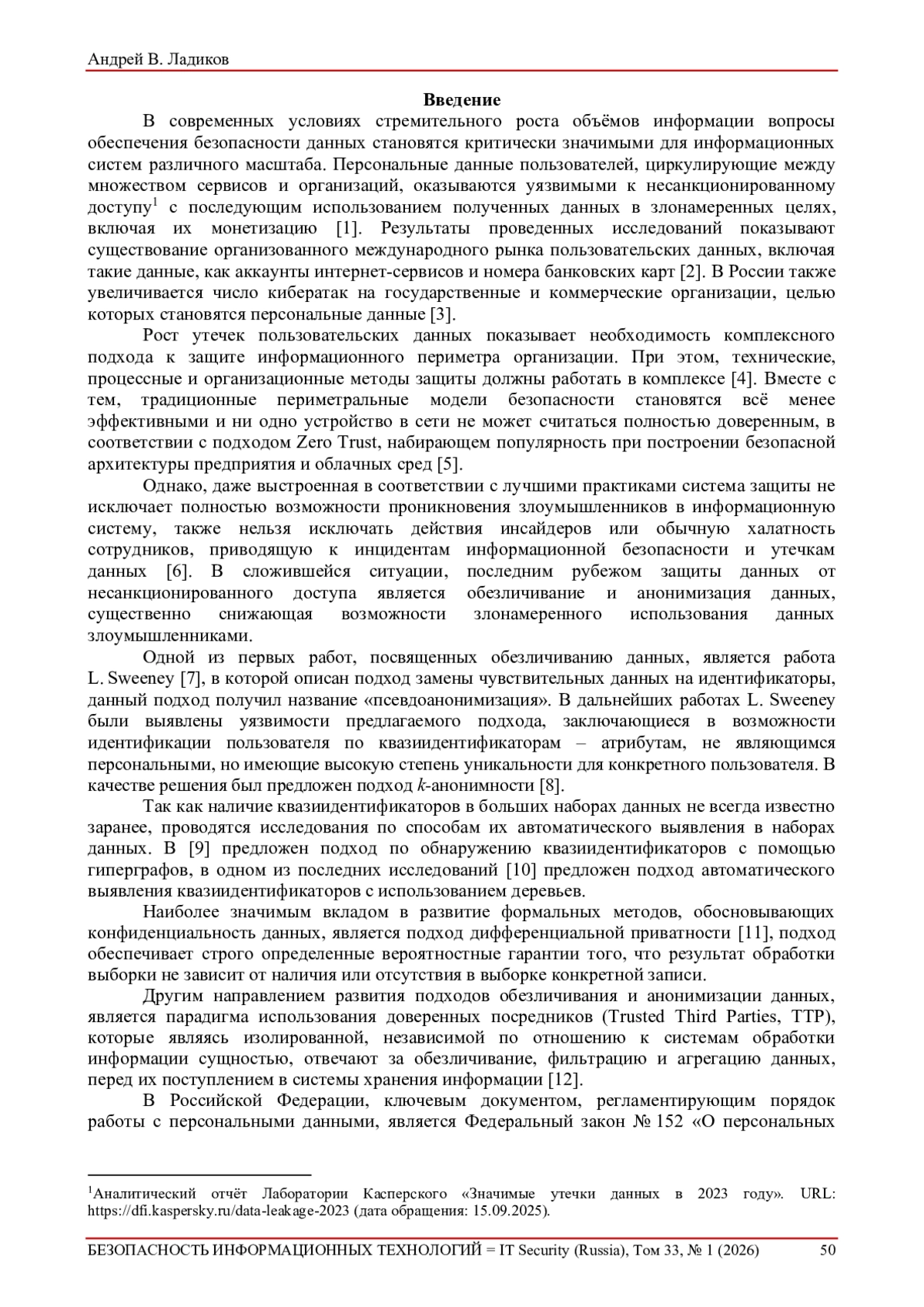 В современных условиях стремительного роста объёмов информации вопросы обеспечения безопасности данных становятся критически значимыми для информационных систем различного масштаба. Персональные данные пользователей, циркулирующие между множеством сервисов и организаций, оказываются уязвимыми к несанкционированному доступу1 с последующим использованием полученных данных в злонамеренных целях, включая их монетизацию [1]. Результаты проведенных исследований показывают существование организованного международного рынка пользовательских данных, включая такие данные, как аккаунты интернет-сервисов и номера банковских карт [2]. В России также увеличивается число кибератак на государственные и коммерческие организации, целью которых становятся персональные данные [3].