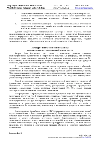 В статье рассматриваются возрастные особенности формирования идентичности у лиц в возрасте 32-35 лет, рассматриваемые как критический этап личностного развития. Автор подчеркивает, что в этом возрасте происходит интеграция различных аспектов идентичности, включая профессиональную, социальную и культурную составляющие. Исследование показывает, что направленность идентификационных процессов определяется как внутренними факторами, такими как самосознание и жизненные цели, так и внешними обстоятельствами, включая социальную среду и культурные нормы. Отмечено, что люди, уделяющие внимание личностному росту и ищущие новые смыслы, лучше адаптируются к меняющимся обстоятельствам, сохраняя целостность идентичности. В результате анализа обсуждаются возможные диссонансы между индивидуальными стремлениями и общественными ожиданиями, а также стратегии преодоления возникающих кризисов идентичности. В статье подчеркивается важность поддержки процессов формирования идентичности в этом возрастном диапазоне для обеспечения психологического благополучия и успешной самореализации личности. Выявлено, что идентичность 32-35-летних складывается из нескольких уровней: личностный уровень (ядро, включающее основные ценности, убеждения, смысловые образования) и социальный уровень (совокупность ролевых позиций (супруг/супруга, родитель, профессионал и т. д.). Отмечено, что в возрасте 32-35 лет развитие идентичности становится многомерным и гибким процессом, в котором сочетаются личная целостность, социальные роли и глобализирующийся мир. Учитывая эти особенности, специалисты могут оказать целенаправленную поддержку, способствуя позитивному формированию идентичности и снижению риска затяжных кризисов.