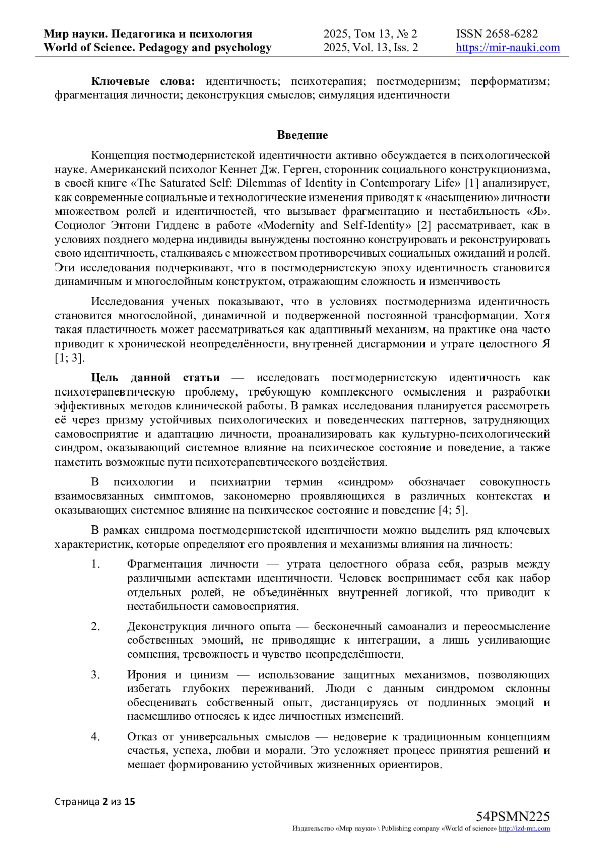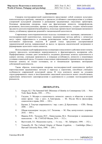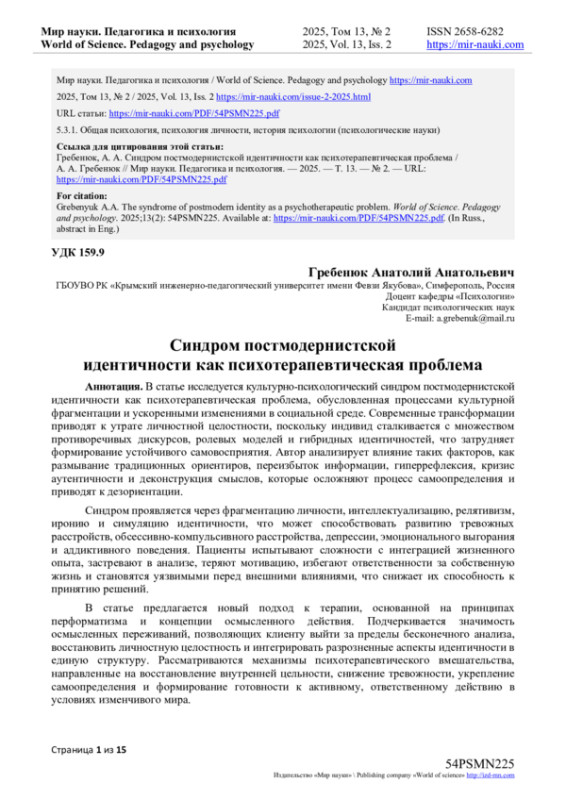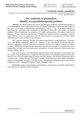 В статье исследуется культурно-психологический синдром постмодернистской идентичности как психотерапевтическая проблема, обусловленная процессами культурной фрагментации и ускоренными изменениями в социальной среде. Современные трансформации приводят к утрате личностной целостности, поскольку индивид сталкивается с множеством противоречивых дискурсов, ролевых моделей и гибридных идентичностей, что затрудняет формирование устойчивого самовосприятия. Автор анализирует влияние таких факторов, как размывание традиционных ориентиров, переизбыток информации, гиперрефлексия, кризис аутентичности и деконструкция смыслов, которые осложняют процесс самоопределения и приводят к дезориентации. Синдром проявляется через фрагментацию личности, интеллектуализацию, релятивизм, иронию и симуляцию идентичности, что может способствовать развитию тревожных расстройств, обсессивно-компульсивного расстройства, депрессии, эмоционального выгорания и аддиктивного поведения. Пациенты испытывают сложности с интеграцией жизненного опыта, застревают в анализе, теряют мотивацию, избегают ответственности за собственную жизнь и становятся уязвимыми перед внешними влияниями, что снижает их способность к принятию решений. В статье предлагается новый подход к терапии, основанной на принципах перформатизма и концепции осмысленного действия. Подчеркивается значимость осмысленных переживаний, позволяющих клиенту выйти за пределы бесконечного анализа, восстановить личностную целостность и интегрировать разрозненные аспекты идентичности в единую структуру. Рассматриваются механизмы психотерапевтического вмешательства, направленные на восстановление внутренней цельности, снижение тревожности, укрепление самоопределения и формирование готовности к активному, ответственному действию в условиях изменчивого мира.