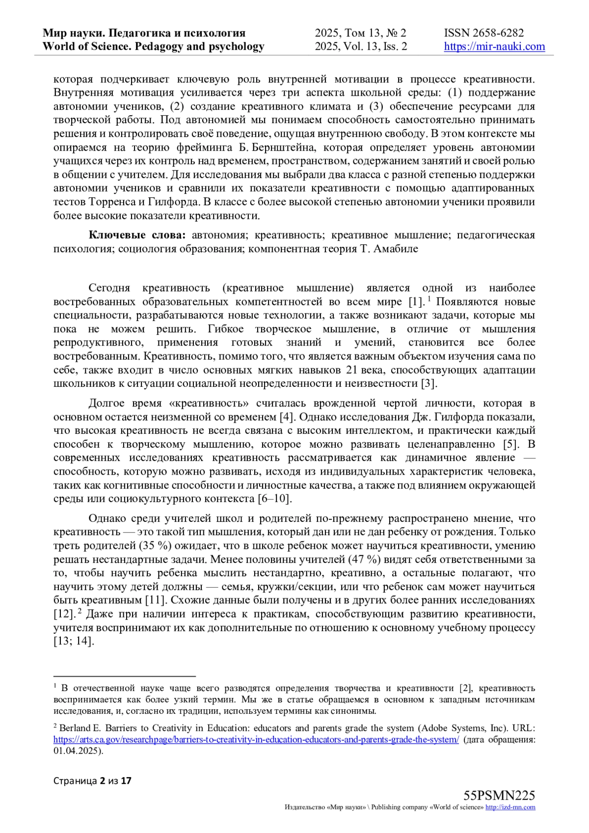 Креативность, как способность создавать новые и контекстуально уместные идеи и решения, признана важной компетенцией в образовании. Она играет ключевую роль в адаптации к изменениям. Мы рассматриваем креативность не как врожденную характеристику, а как динамичное состояние, которое может изменяться под влиянием социальной среды. В фокусе нашего внимания находится школьная среда. Многие исследования изучают влияние школьной среды на креативность учеников, перечисляя факторы, которые способствуют или препятствуют развитию креативности. Однако эти факторы часто не ранжированы по значимости и не рассматриваются во взаимосвязи друг с другом. Для решения этой проблемы мы предлагаем операционализировать понятие «школьной среды, стимулирующей креативность» на основе компонентной теории Т. Амабиле, которая подчеркивает ключевую роль внутренней мотивации в процессе креативности. Внутренняя мотивация усиливается через три аспекта школьной среды: (1) поддержание автономии учеников, (2) создание креативного климата и (3) обеспечение ресурсами для творческой работы. Под автономией мы понимаем способность самостоятельно принимать решения и контролировать своё поведение, ощущая внутреннюю свободу. В этом контексте мы опираемся на теорию фрейминга Б. Бернштейна, которая определяет уровень автономии учащихся через их контроль над временем, пространством, содержанием занятий и своей ролью в общении с учителем. Для исследования мы выбрали два класса с разной степенью поддержки автономии учеников и сравнили их показатели креативности с помощью адаптированных тестов Торренса и Гилфорда. В классе с более высокой степенью автономии ученики проявили более высокие показатели креативности.
