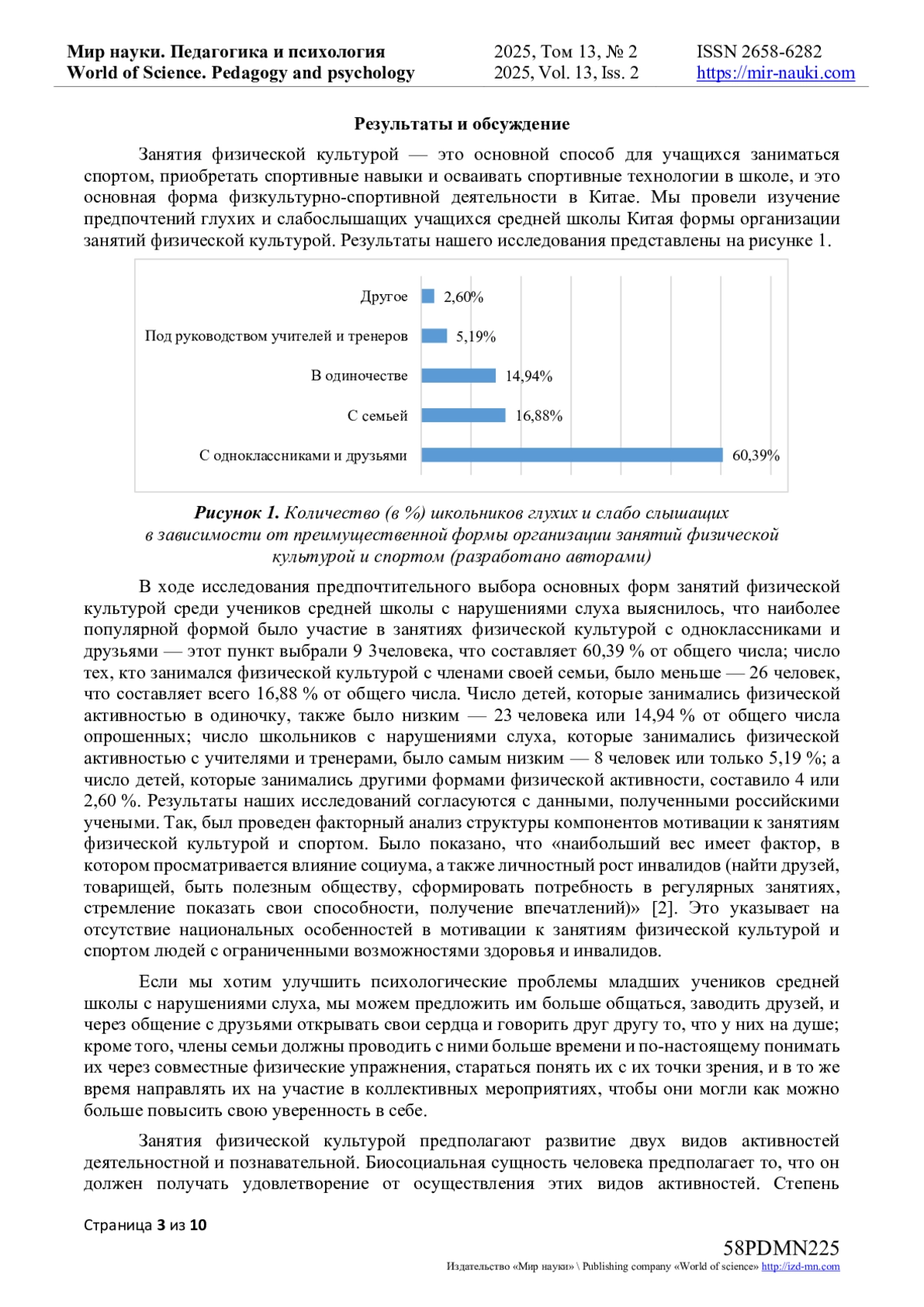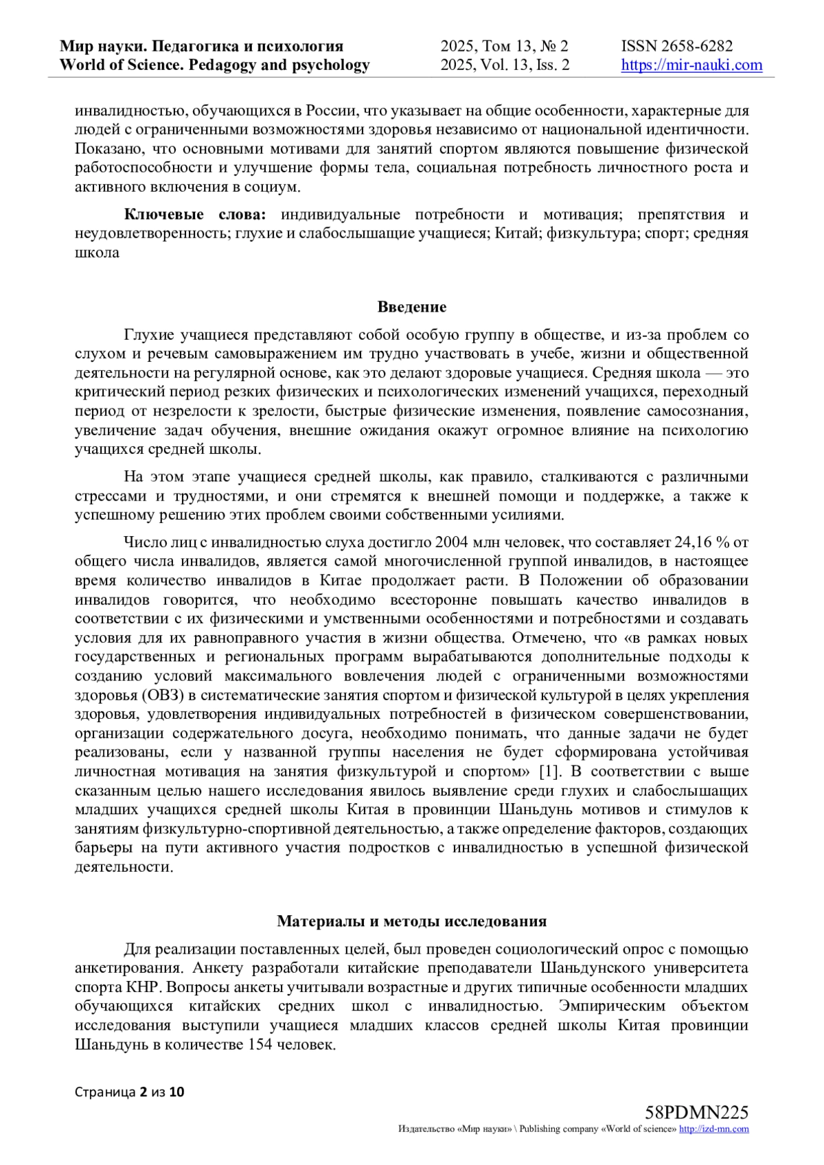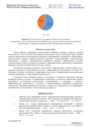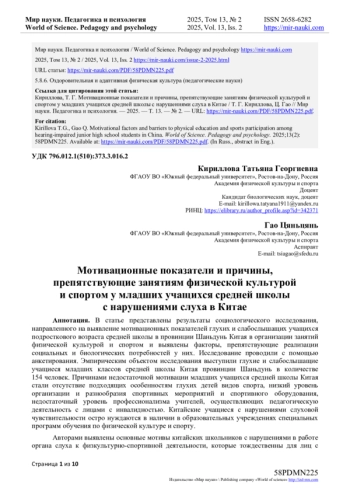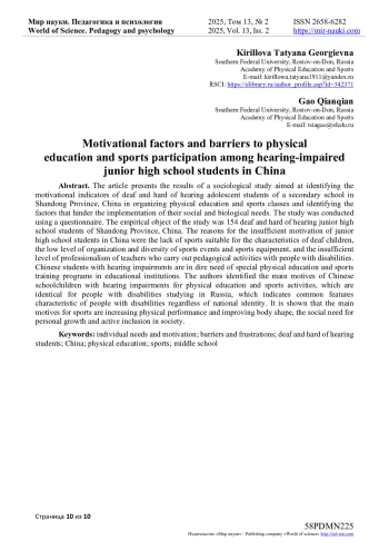 В статье представлены результаты социологического исследования, направленного на выявление мотивационных показателей глухих и слабослышащих учащихся подросткового возраста средней школы в провинции Шаньдунь Китая в организации занятий физической культурой и спортом и выявлены факторы, препятствующие реализации социальных и биологических потребностей у них. Исследование проводили с помощью анкетирования. Эмпирическим объектом исследования выступили глухие и слабослышащие учащиеся младших классов средней школы Китая провинции Шаньдунь в количестве 154 человек. Причинами недостаточной мотивации младших учащихся средней школы Китая стали отсутствие подходящих особенностям глухих детей видов спорта, низкий уровень организации и разнообразия спортивных мероприятий и спортивного оборудования, недостаточный уровень профессионализма учителей, осуществляющих педагогическую деятельность с лицами с инвалидностью. Китайские учащиеся с нарушениями слуховой чувствительности остро нуждаются в наличии в образовательных учреждениях специальных программ обучения по физической культуре и спорту. Авторами выявлены основные мотивы китайских школьников с нарушениями в работе органа слуха к физкультурно-спортивной деятельности, которые тождественны для лиц с инвалидностью, обучающихся в России, что указывает на общие особенности, характерные для людей с ограниченными возможностями здоровья независимо от национальной идентичности. Показано, что основными мотивами для занятий спортом являются повышение физической работоспособности и улучшение формы тела, социальная потребность личностного роста и активного включения в социум.