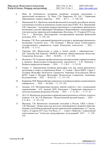 4. Пань, Ц. Особенности мотивации китайских младших школьников к двигательной активности / Ц. Пань, Г.М. Лаврухина, Ю. Гуй // Управление образованием: теория и практика. - 2024. - № 1-1. - С. 220-229. EDN: OCZTLP