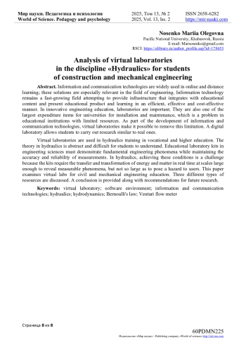 Информационно-коммуникационные технологии широко применяются в онлайн- и дистанционном обучении, особенно актуальны эти решения в области инжиниринга. Информационные технологии остаются быстрорастущим направлением, пытающуюся предоставить инфраструктуру, которая интегрируется в учебный контент, и представлять образовательный продукт и обучение эффективно, действенно и экономически выгодно. В инновационном инженерном образовании значимыми являются лаборатории. Они же являются одной из самых больших статей расходов университетов на установку и обслуживание, что является проблемой в образовательных учреждениях с ограниченными средствами. В рамках развития информационно-коммуникационных технологий виртуальные лаборатории позволяют снять это ограничение. Цифровая лаборатория дает возможность обучающимся выполнять исследования, аналогичные настоящим. Виртуальные лаборатории используются в обучении гидравлики в профессиональном и высшем образовании. Теория в гидравлике абстрактна и сложна для понимания студентов. Учебные лабораторные комплекты по инженерным наукам должны демонстрировать основополагающие инженерные явления, сохраняя при этом точность и достоверность измерений. В гидравлике достижение этих условий представляет собой проблему, поскольку комплекты требуют переноса и преобразования энергии и вещества в реальном времени в масштабах, достаточно больших, чтобы выявлять измеримые явления, но не настолько больших, чтобы представлять опасность для пользователей. В настоящей статье рассматривается виртуальные лабораторные работы для инженерного образования в области строительства и механики. Автором обсуждаются три различных вида ресурсов. Дается заключение вместе с рекомендациями для будущих исследований.