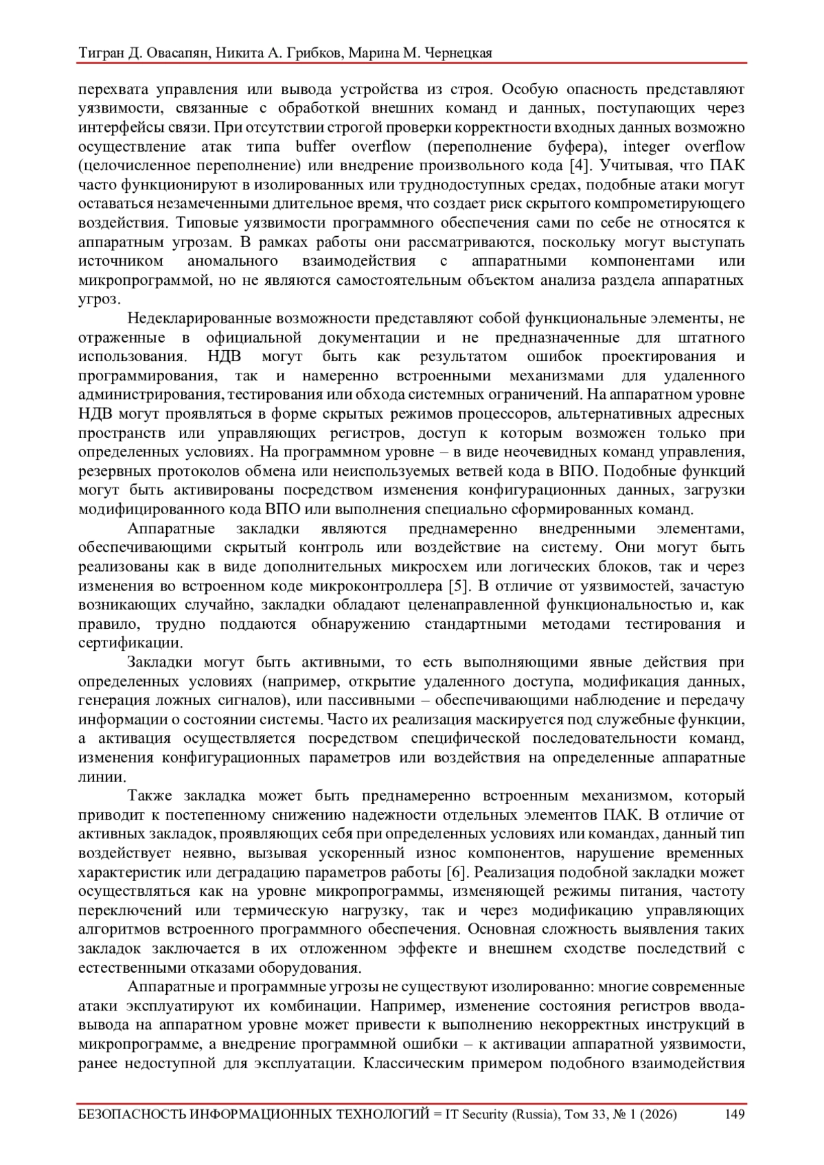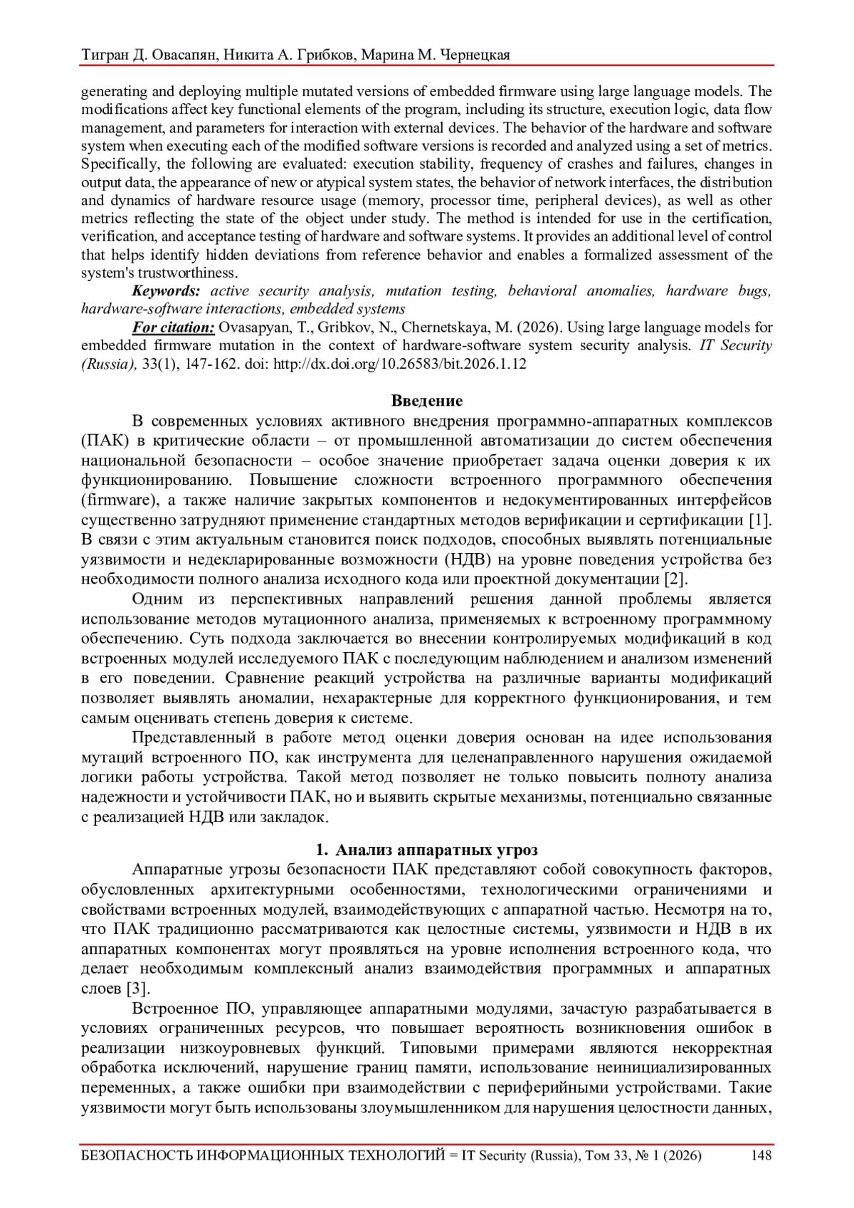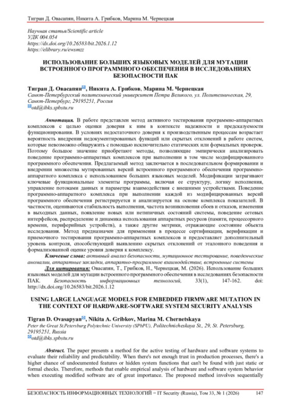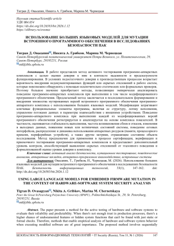 В современных условиях активного внедрения программно-аппаратных комплексов (ПАК) в критические области – от промышленной автоматизации до систем обеспечения национальной безопасности – особое значение приобретает задача оценки доверия к их функционированию. Повышение сложности встроенного программного обеспечения (firmware), а также наличие закрытых компонентов и недокументированных интерфейсов существенно затрудняют применение стандартных методов верификации и сертификации [1]. В связи с этим актуальным становится поиск подходов, способных выявлять потенциальные уязвимости и недекларированные возможности (НДВ) на уровне поведения устройства без необходимости полного анализа исходного кода или проектной документации [2].