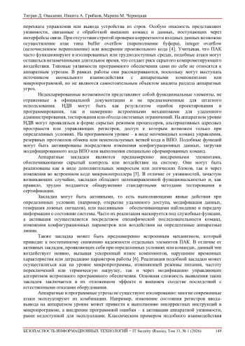 5. Kostromitin K.I., Dokuchaev B.N., Kozlov D.A. Analysis of the most common software and hardware vulnerabilities in microprocessor systems.International Russian Automation Conference (RusAutoCon). IEEE, 2020, pp. 1031-1036. DOI: 10.1109/RusAutoCon49822.2020.9208037