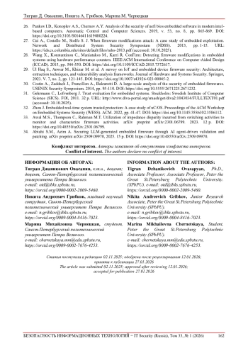 26. Pankov I.D., Konoplev A.S., Chernov A.Y. Analysis of the security of uefi bios embedded software in modern intel-based computers. Automatic Control and Computer Sciences. 2019, v. 53, no. 8, pp. 865-869. DOI: 10.3103/S0146411619080224