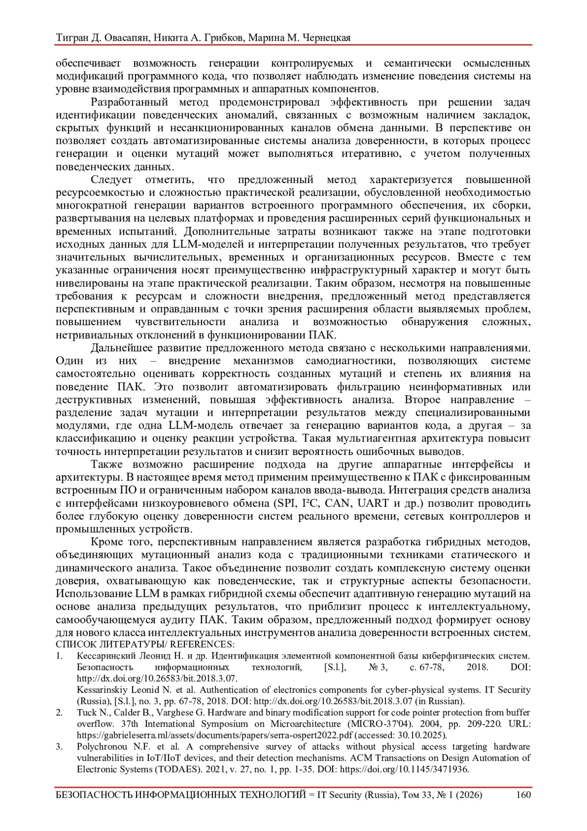 1. Кессаринский Леонид Н. и др. Идентификация элементной компонентной базы киберфизических систем. Безопасность информационных технологий, [S.l.], № 3, с. 67-78, 2018. DOI: 10.26583/bit.2018.3.07