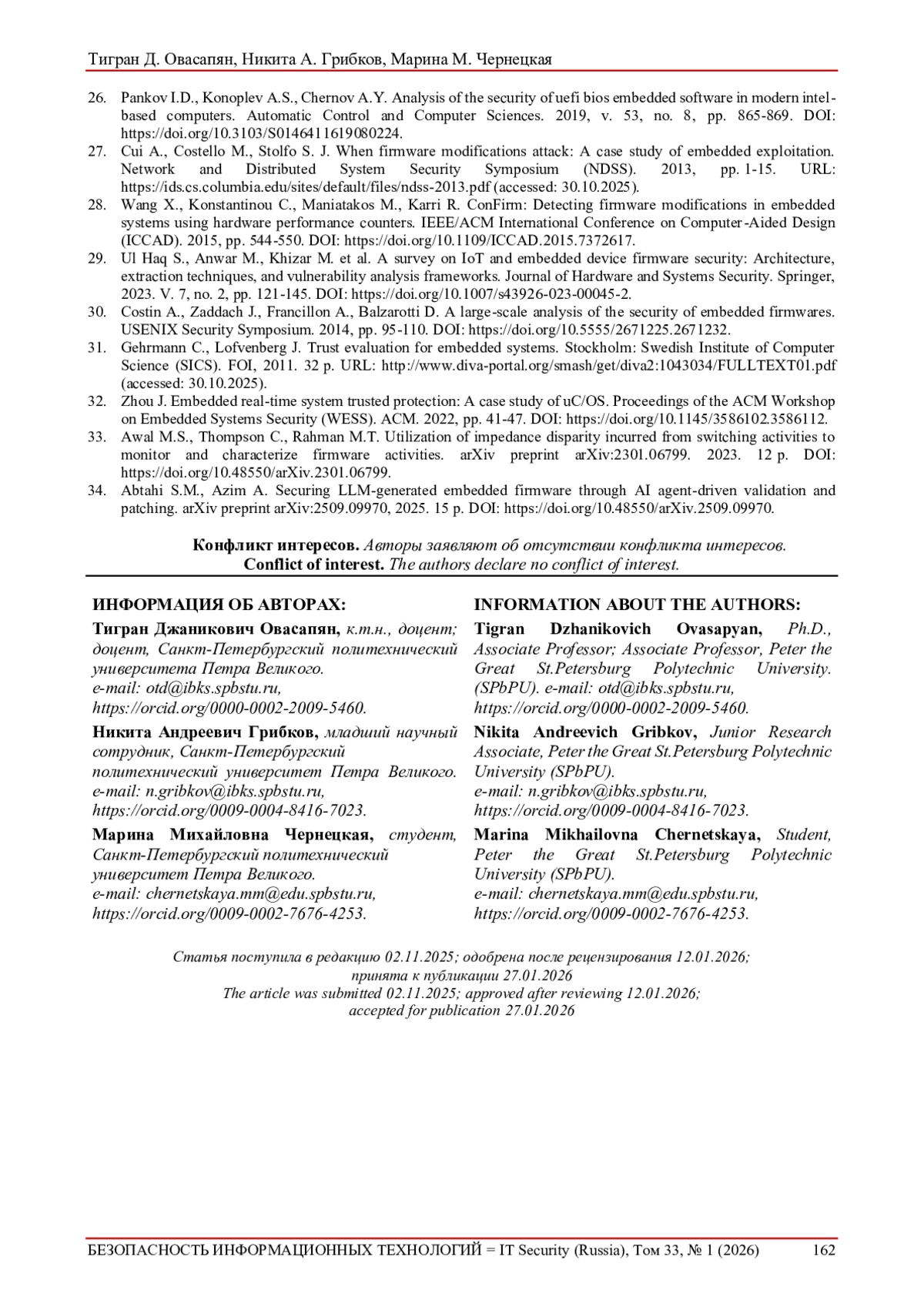 33. Awal M.S., Thompson C., Rahman M.T. Utilization of impedance disparity incurred from switching activities to monitor and characterize firmware activities. arXiv preprint arXiv:2301.06799. 2023. 12 p. DOI: 10.48550/arXiv.2301.06799