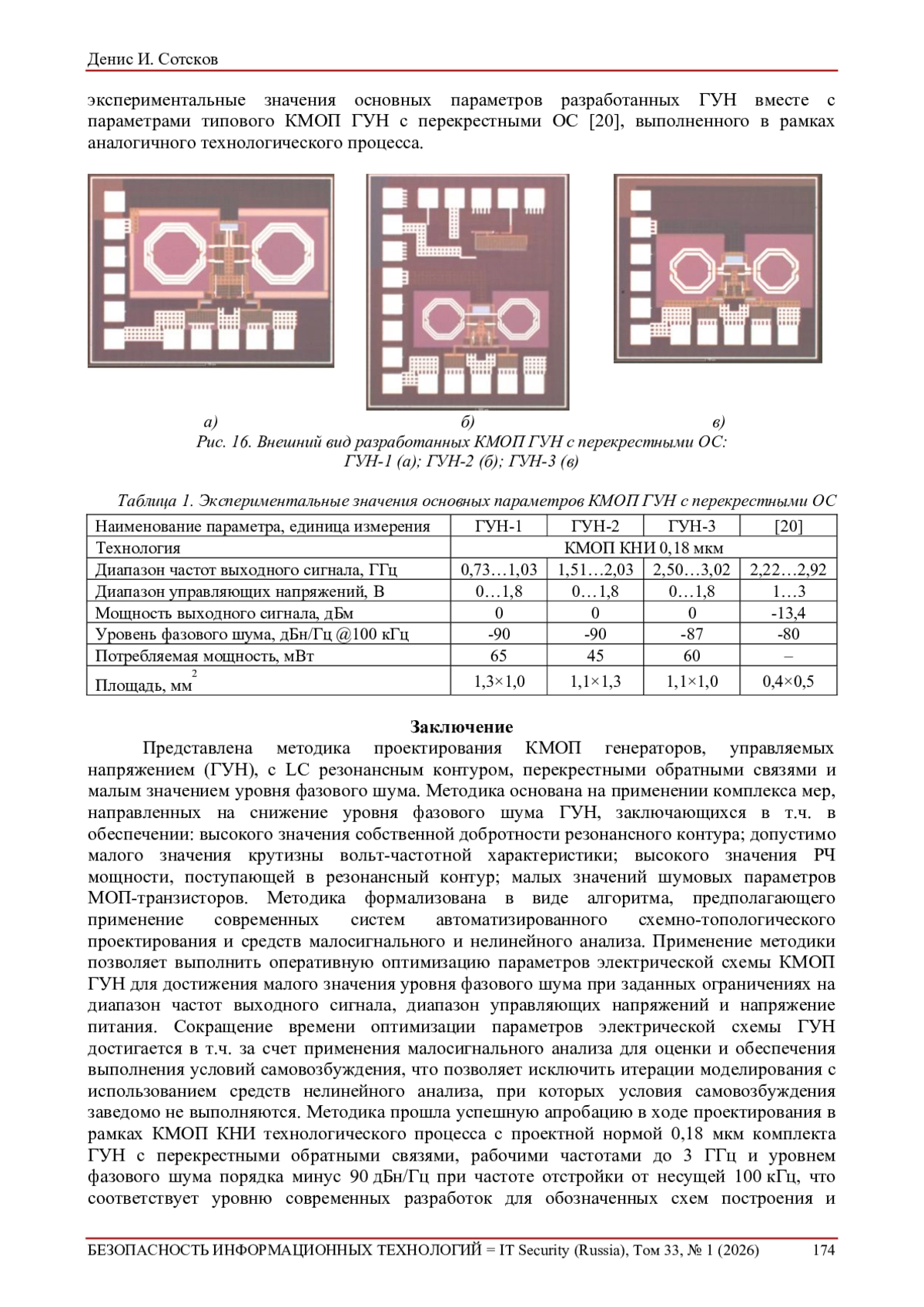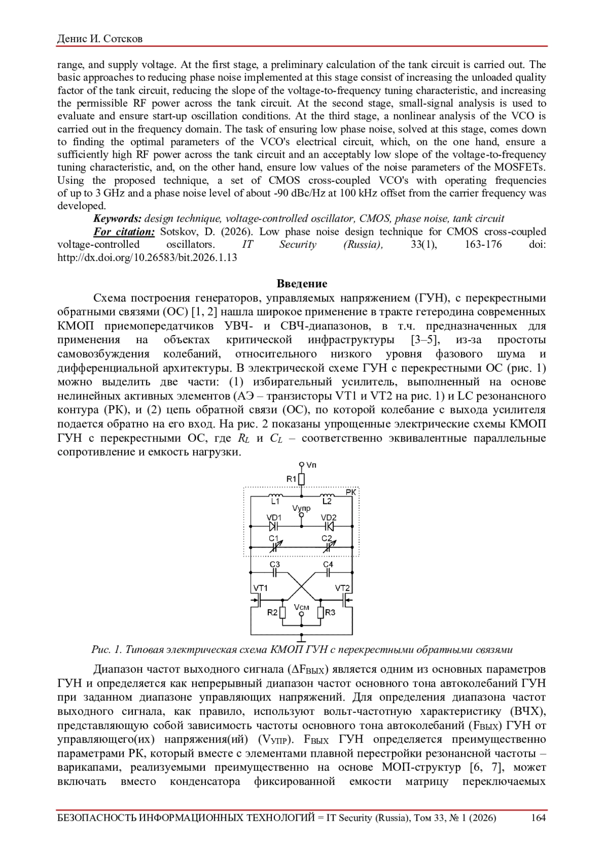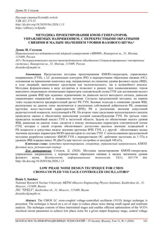 Представлена методика проектирования КМОП-генераторов, управляемых напряжением (ГУН), с LC резонансным контуром (РК) и перекрестными обратными связями (ОС), основанная на применении комплекса мер, направленных на снижение уровня фазового шума (ФШ), в ходе операций, выполняемых средствами как малосигнального, так и нелинейного анализа. Методика формализована в виде алгоритма и позволяет в рамках трех взаимосвязанных этапов выполнить оперативную оптимизацию параметров электрической схемы ГУН для достижения малого значения уровня ФШ при заданных ограничениях на диапазон частот выходного сигнала, диапазон управляющих напряжений и напряжение питания. Согласно предложенной методике, на первом этапе осуществляется предварительный расчет РК ГУН. Базовые подходы к снижению уровня ФШ, реализуемые на данном этапе заключаются в увеличении собственной добротности РК, снижении крутизны вольт-частотной характеристики (ВЧХ) РК и увеличении значения допустимой радиочастотной мощности, поступающей в РК. На втором этапе средствами малосигнального анализа проводится оценка и обеспечение выполнения условий самовозбуждения ГУН. На третьем этапе проводится нелинейный анализ ГУН в частотной области. Задача по обеспечению малого уровня ФШ, решаемая на данном этапе, сводится к поиску оптимальных параметров электрической схемы ГУН, которые с одной стороны обеспечивают достаточно высокое значение подводимой к РК мощности и допустимо низкое значение крутизны ВЧХ ГУН, а с другой – обеспечивают малые значения шумовых параметров МОП-транзисторов из состава ГУН. С использованием предложенной методики разработан комплект КМОП ГУН с перекрестными ОС, рабочими частотами до 3 ГГц и уровнем ФШ порядка минус 90 дБн/Гц при частоте отстройки от несущей 100 кГц.