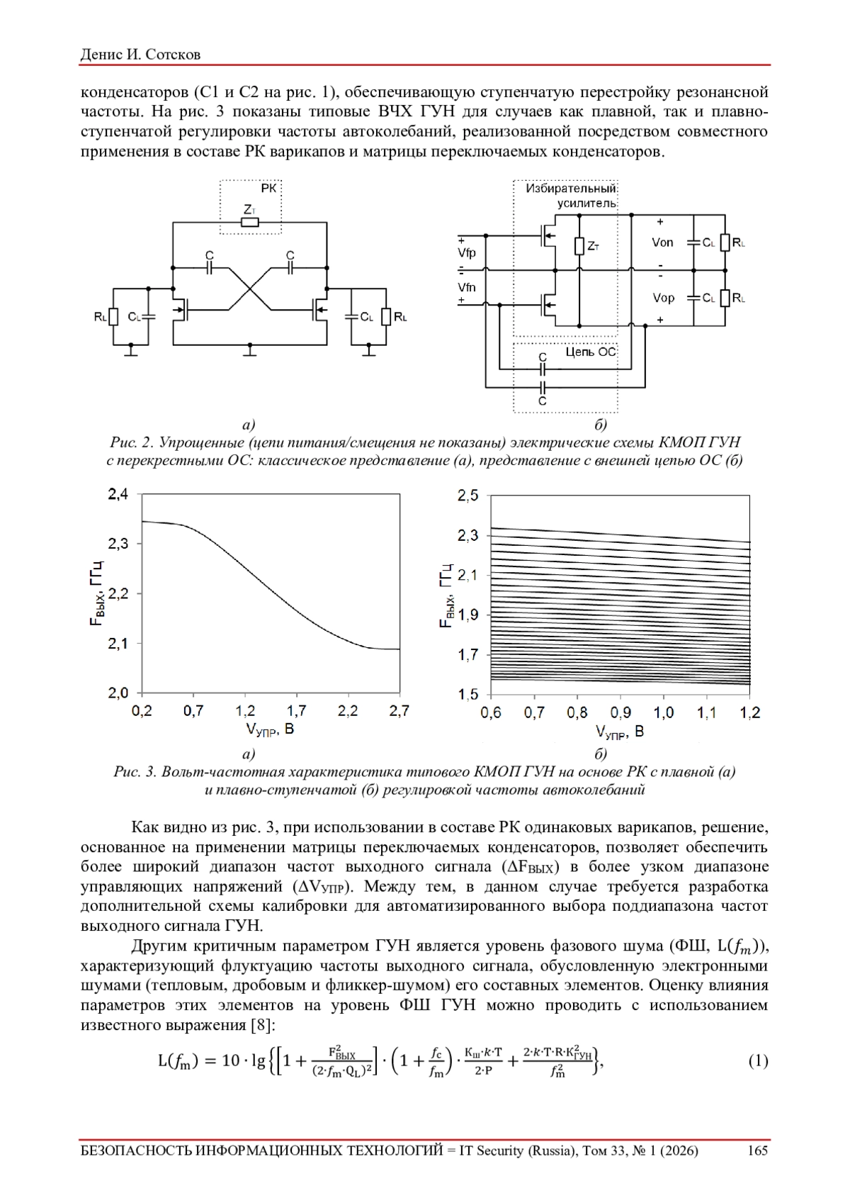Схема построения генераторов, управляемых напряжением (ГУН), с перекрестными обратными связями (ОС) [1, 2] нашла широкое применение в тракте гетеродина современных КМОП приемопередатчиков УВЧ- и СВЧ-диапазонов, в т. ч. предназначенных для применения на объектах критической инфраструктуры [3–5], из-за простоты самовозбуждения колебаний, относительного низкого уровня фазового шума и дифференциальной архитектуры. В электрической схеме ГУН с перекрестными ОС (рис. 1) можно выделить две части: (1) избирательный усилитель, выполненный на основе нелинейных активных элементов (АЭ – транзисторы VT1 и VT2 на рис. 1) и LC резонансного контура (РК), и (2) цепь обратной связи (ОС), по которой колебание с выхода усилителя подается обратно на его вход. На рис. 2 показаны упрощенные электрические схемы КМОП ГУН с перекрестными ОС, где RL и CL – соответственно эквивалентные параллельные сопротивление и емкость нагрузки.