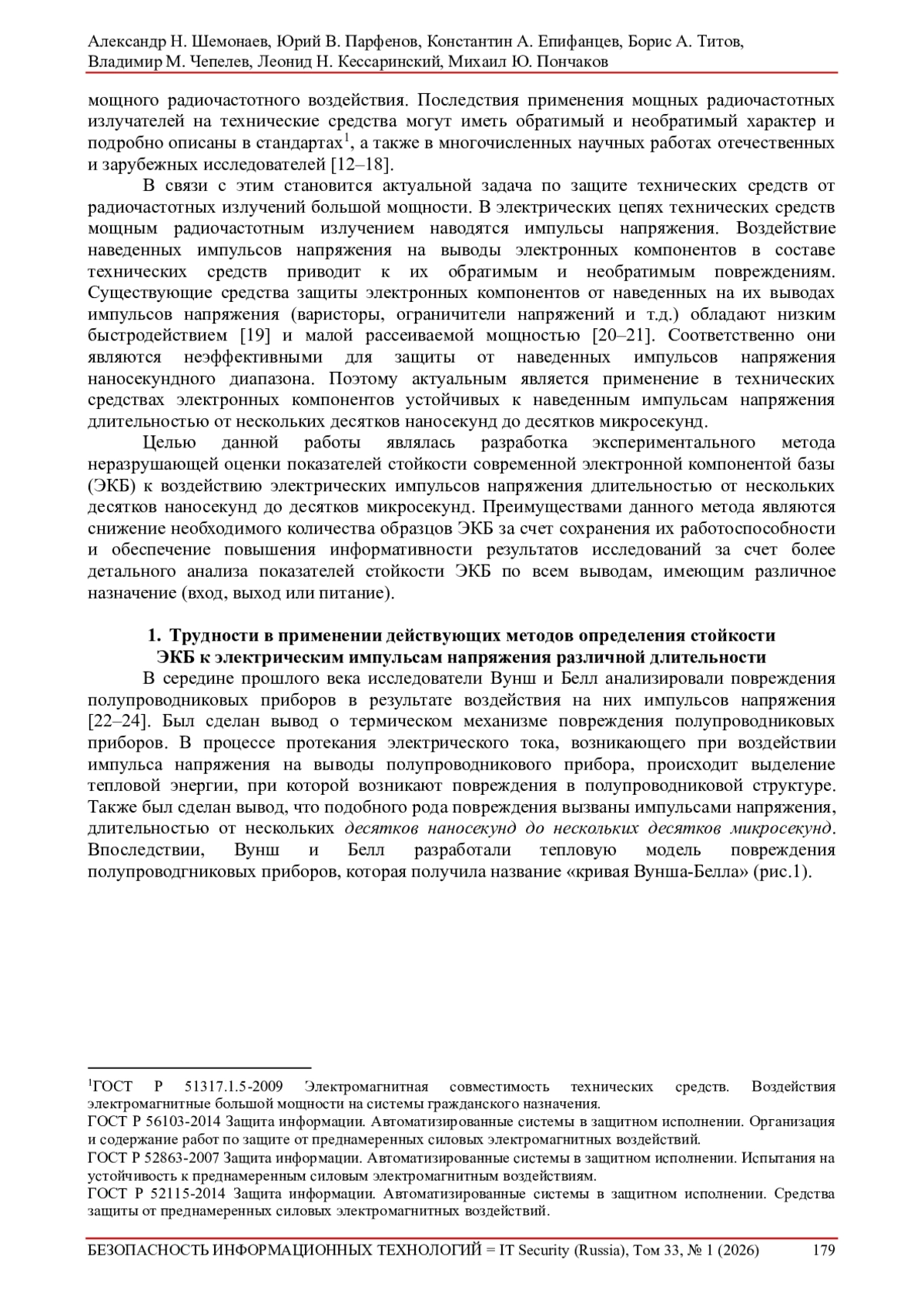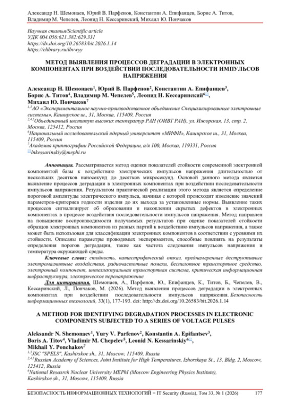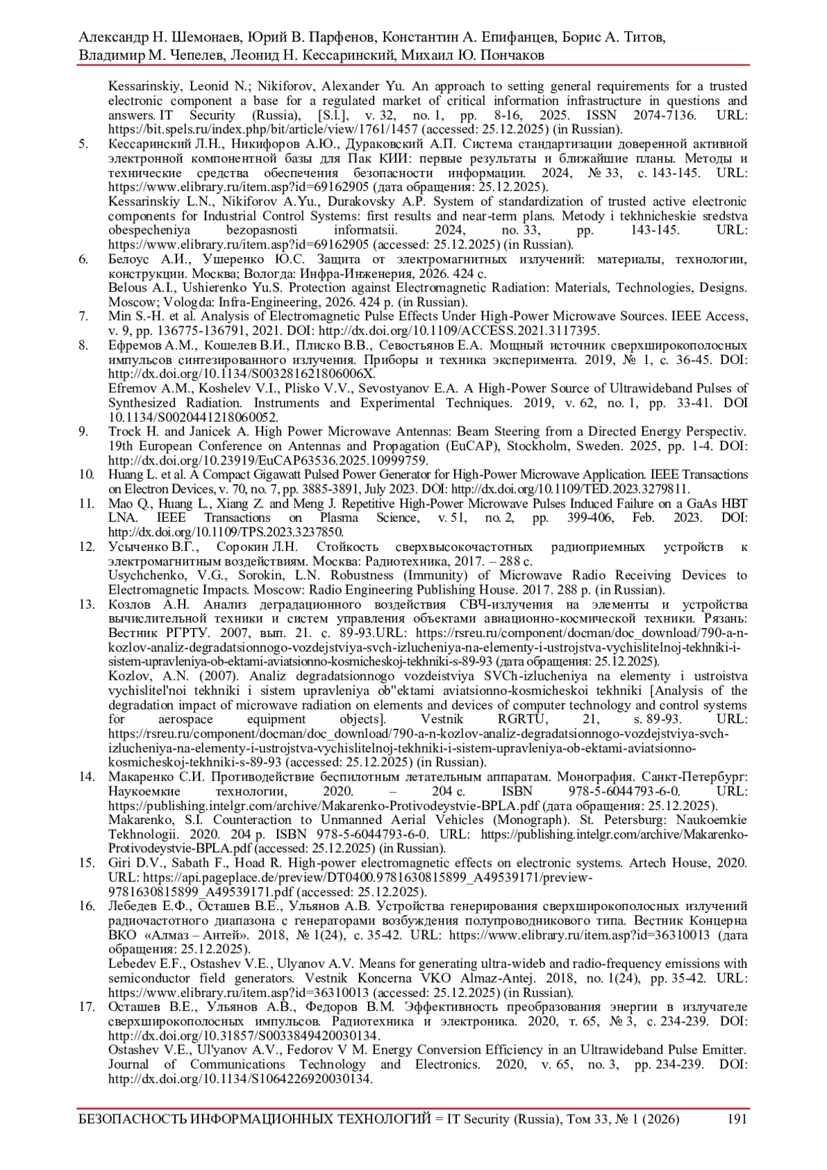 2. Шемонаев, Александр Н. и др. Методический подход к оценке стойкости критических элементов инфраструктуры интеллектуальных транспортных систем к электромагнитным воздействиям большой мощности. Безопасность информационных технологий, [S.l.], т. 32, № 4, с. 52-64, 2025. ISSN 2074-7136. DOI: 10.26583/bit.2025.4.04