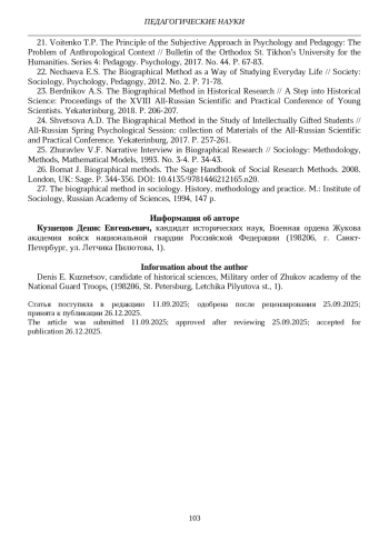 6. Тендрякова М.В. Биографический метод на перекрестке гуманитарных исследований // Традиционная культура. 2022. Т. 23, № 4. С. 111-124. EDN: UFDBYU