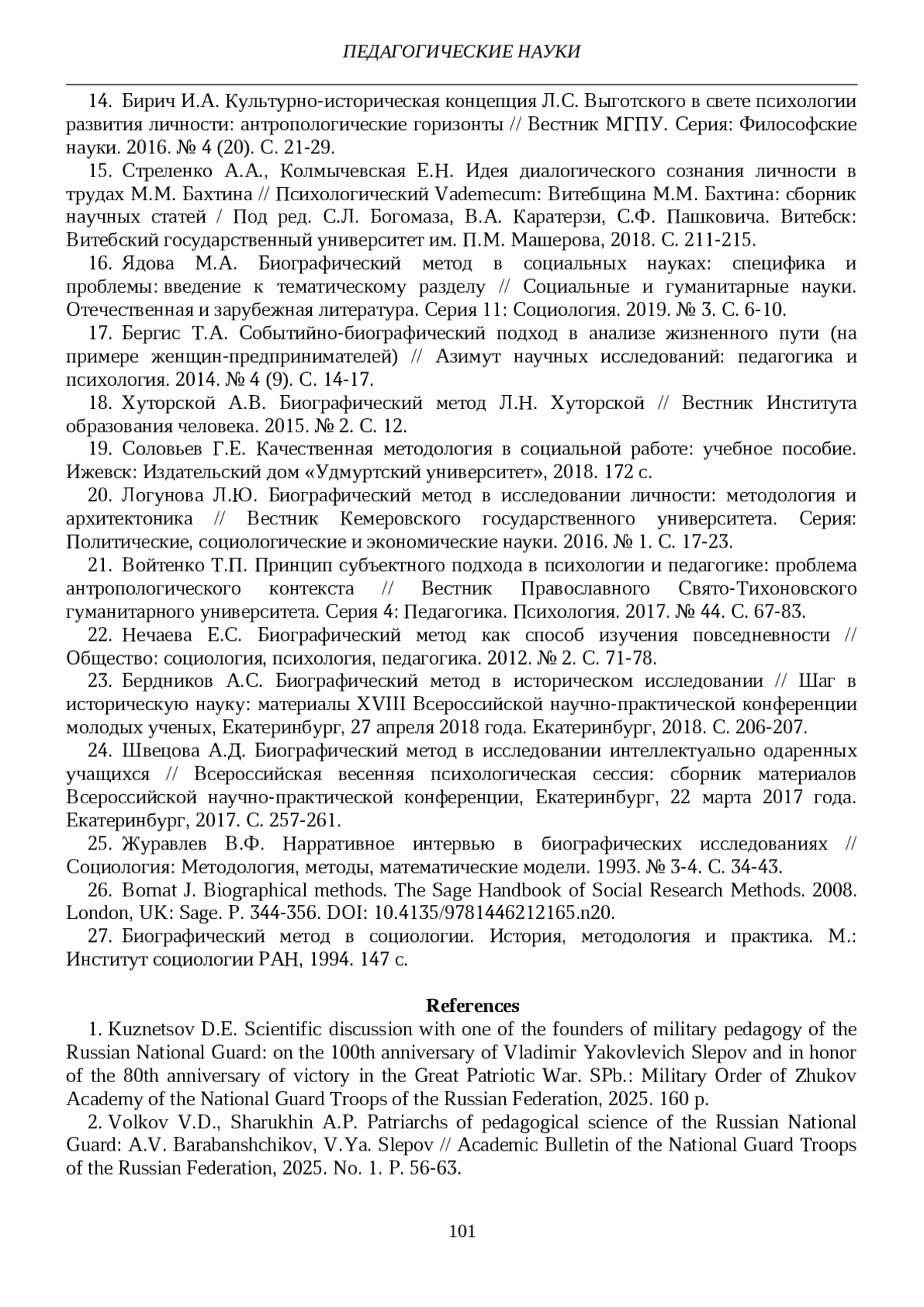 16. Ядова М.А. Биографический метод в социальных науках: специфика и проблемы: введение к тематическому разделу // Социальные и гуманитарные науки. Отечественная и зарубежная литература. Серия 11: Социология. 2019. № 3. С. 6-10. EDN: BFYWAU