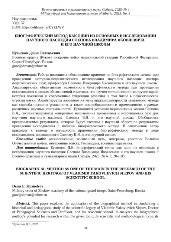 Работа посвящена обоснованию применения биографического метода при проведении историко-педагогического исследования научного наследия доктора педагогических наук, профессора Слепова Владимира Яковлевича и его научной школы. Анализируются объективные возможности биографического метода при проведении исследования в рамках обозначенной тематики, его научно-методический инструментарий, история появления и современные тенденции развития, в том числе в педагогической отрасли науки. Акцентируется внимание на мультидисциплинарности указанного метода как способа познания реальности, а также востребованности и применимости в рамках различных научных специальностей. Приводится условная периодизация жизни Слепова В. Я., систематизируются конкретные направления применения и источниковая база для изучения научного наследия Слепова В. Я. и его научной школы. Обобщаются предполагаемые результаты, которые будут введены в научный оборот по результатам проведения исследования с позиций биографического метода. В заключении автор приходит к выводу о валидности применения биографического метода в ходе исследования, посвященного Слепову В. Я. и его научной школе.