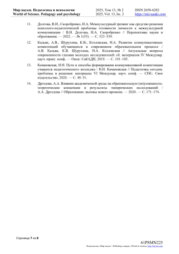 12. Кальяк, А.В., Шурухина, К.В., Козловская, Н.А. Развитие коммуникативных компетенций обучающихся в современном образовательном процессе / А.В. Кальяк, К.В. Шурухина, Н.А. Козловская // Актуальные вопросы современности глазами молодых исследователей: сб. материалов IV Междунар. науч.-практ. конф. - Омск: СибАДИ, 2019. - С. 101-105. EDN: HMBHWU