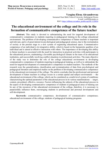 Данное исследование посвящено обоснованию необходимости целенаправленного формирования коммуникативной компетентности у студентов педагогических направлений подготовки в образовательной среде колледжа. Проблема формирования коммуникативной компетентности будущих учителей является важной и актуальной, вызывает большой интерес в психолого-педагогической науке, что обусловлено переориентацией на современном этапе социума на новую систему организации образовательного пространства. Коммуникативная компетентность личности - это интегративная ее способность, которая базируется на гуманистических качествах личности и направлена на эффективное взаимодействие с окружающими. Важность развития данной способности у будущих педагогов связана с необходимостью взаимодействия в практической деятельности с участниками образовательного процесса, поддержания благоприятного психологического климата в коллективе образовательного учреждения, успешным разрешением конфликтных ситуаций профессиональной деятельности.