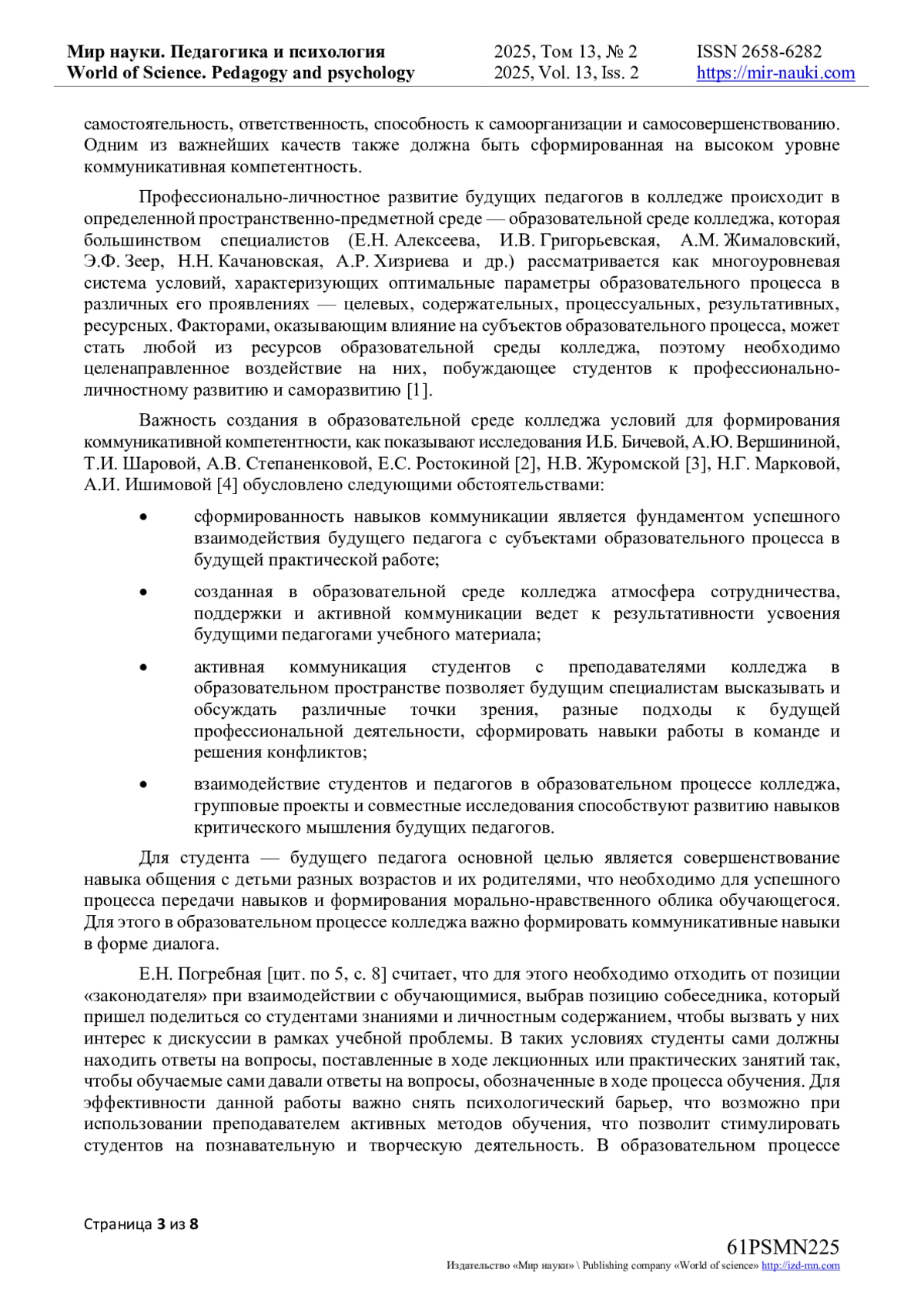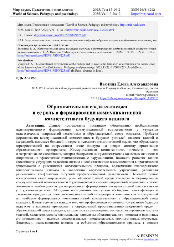 2. Бичева, И.Б., Вершинина, А.Ю., Шарова, Т.И., Степаненкова, А.В., Ростокина, Е.С. Проблемы и перспективы повышения коммуникативной компетентности педагога / И.Б. Бичева, А.Ю. Вершинина, Т.И. Шарова, А.В. Степаненкова, Е.С. Ростокина // Современные наукоемкие технологии. - 2020. - № 11-2. - С. 337-341. EDN: OJIJSN
