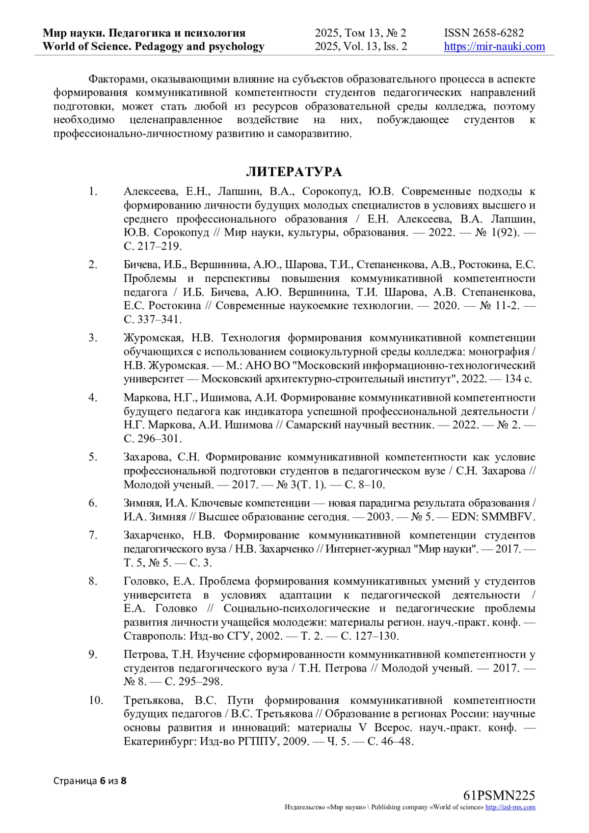 7. Захарченко, Н.В. Формирование коммуникативной компетенции студентов педагогического вуза / Н.В. Захарченко // Интернет-журнал “Мир науки”. - 2017. - Т. 5, № 5. - С. 3.