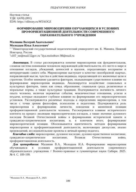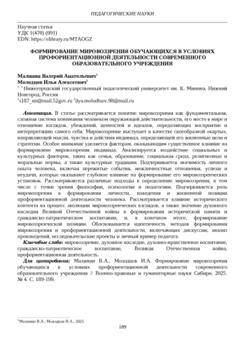 11. Малинин В.А. Мировоззренческое сознание в современном обществе / Вестник Нижегородского университета им. Н.И. Лобачевского. Серия: Инновации в образовании. 2005. № 1. С. 245. EDN: HQTEPD