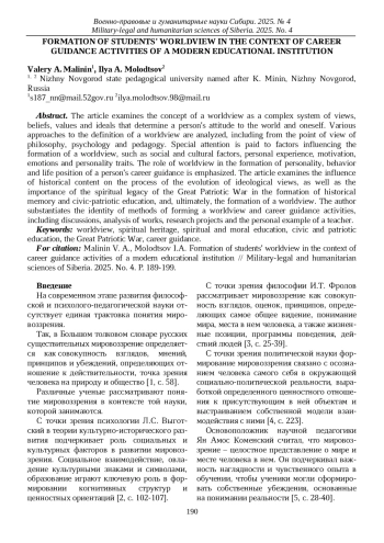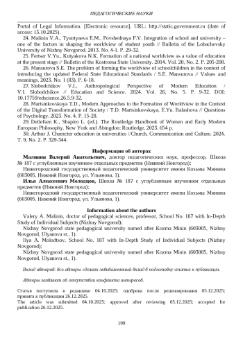 24. Малинин В.А., Тюнтяева Е.М., Повшедная Ф.В. Интеграция школы и вуза - один из факторов формирования мировоззрения учащейся молодежи // Вестник Нижегородского университета им. Н.И. Лобачевского. 2013. № 4-1. С. 29-32.
