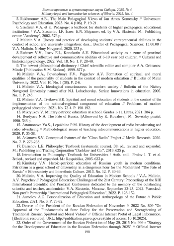 12. Малинин В.А. Тивикова С.К. Духовно-нравственное воспитание обучающихся в условиях реализации национально-регионального компонента образования // Проблемы современного педагогического образования. 2021. № 72-4. С. 190-192. EDN: IDPVAE