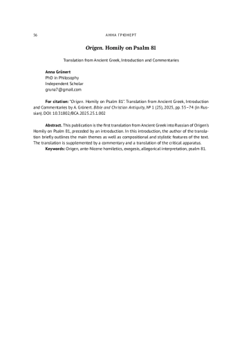 Данная публикация представляет собой первый перевод с древнегреческого на русский язык беседы Оригена на псалом 81 в сопровождении вступительной статьи. В ней автор перевода кратко обозначает основные темы, композиционные и стилистические особенности текста. Перевод дополнен комментарием и переводом критического аппарата.