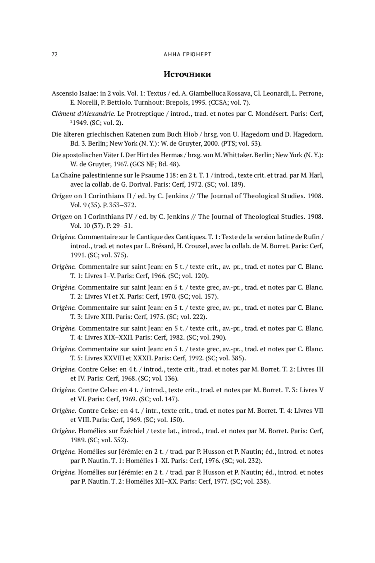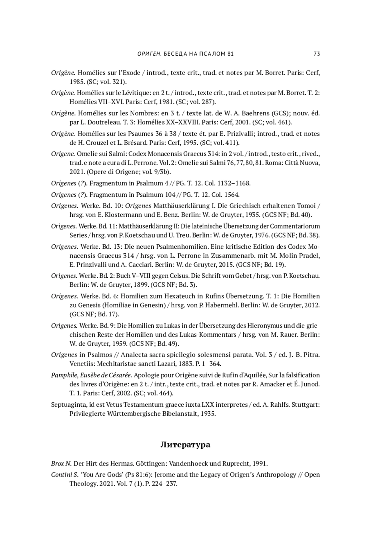 8. Origène.Commentaire sur le Cantique des Cantiques. T. 1: Texte de la version latine de Rufin / introd., trad. et notes par L. Brésard, H. Crouzel, avec la collab. de M. Borret. Paris: Cerf, 1991. (SC; vol. 375).