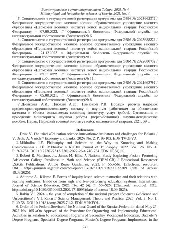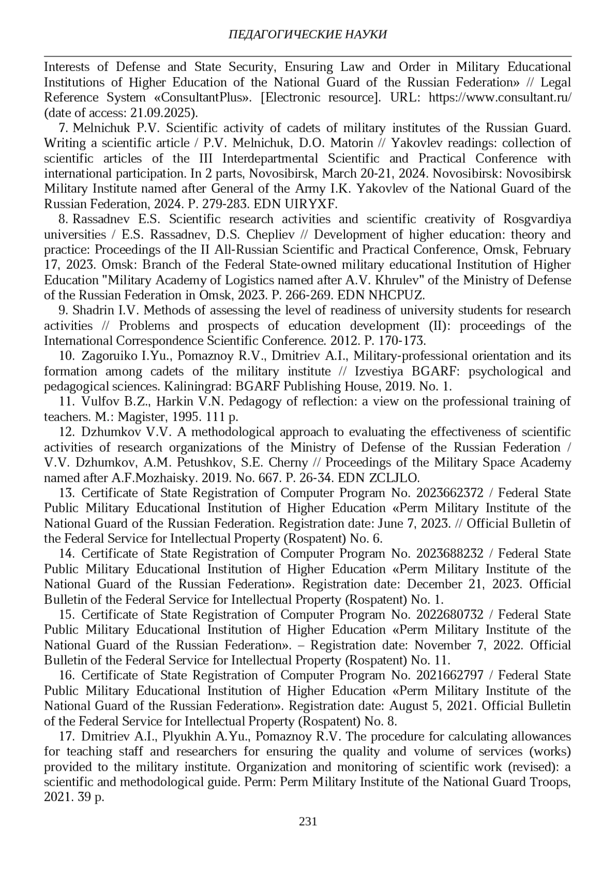 8. Рассаднев Э.С. Научно-исследовательская деятельность и научное творчество вузов Росгвардии / Э.С. Рассаднев, Д.С. Чеплиев // Развитие высшего образования: теория и практика: материалы II Всероссийской научно-практической конференции, Омск, февраля 2023 года. Омск: Филиал федерального государственного казенного военного образовательного учреждения высшего образования “Военная академия материально-технического обеспечения имени А.В. Хрулева” Министерства обороны Российской Федерации в г. Омске, 2023. С. 266-269. EDN: NHCPUZ