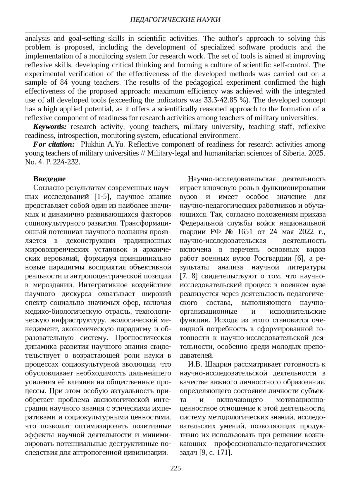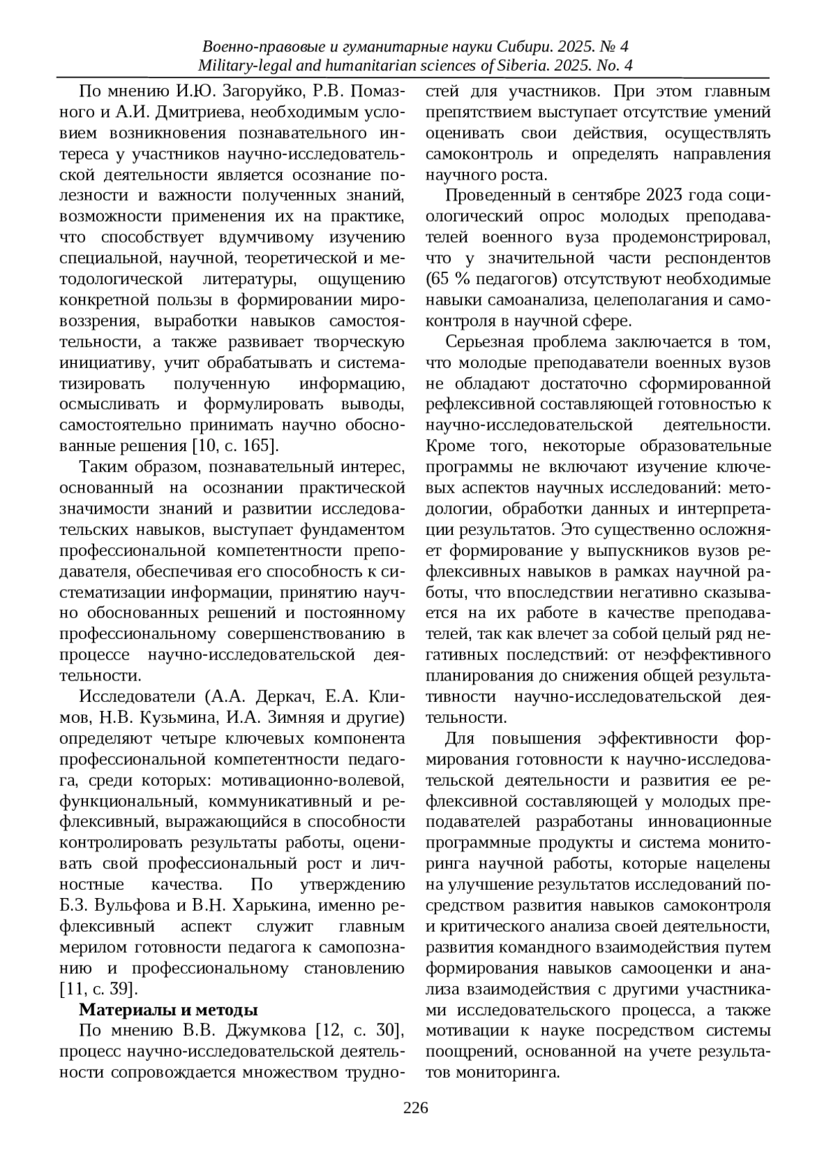 В работе анализируется актуальная проблема развития научно-исследовательского потенциала молодых преподавателей военных вузов. На основе проведенного социологического исследования установлено, что значительная часть педагогического состава (65 %) испытывает трудности с формированием навыков самоанализа и целеполагания в научной деятельности.