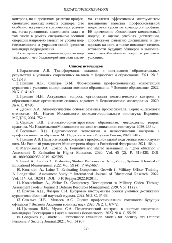 10. Kronholm A., Laine T. Evaluating Competence Growth in Military Officer Training: A Longitudinal Assessment Study // International Journal of Educational Research. 2022. Vol. 114. Art. 102011. DOI: 10.1016/j.ijer.2022.102011 EDN: EBWJMA