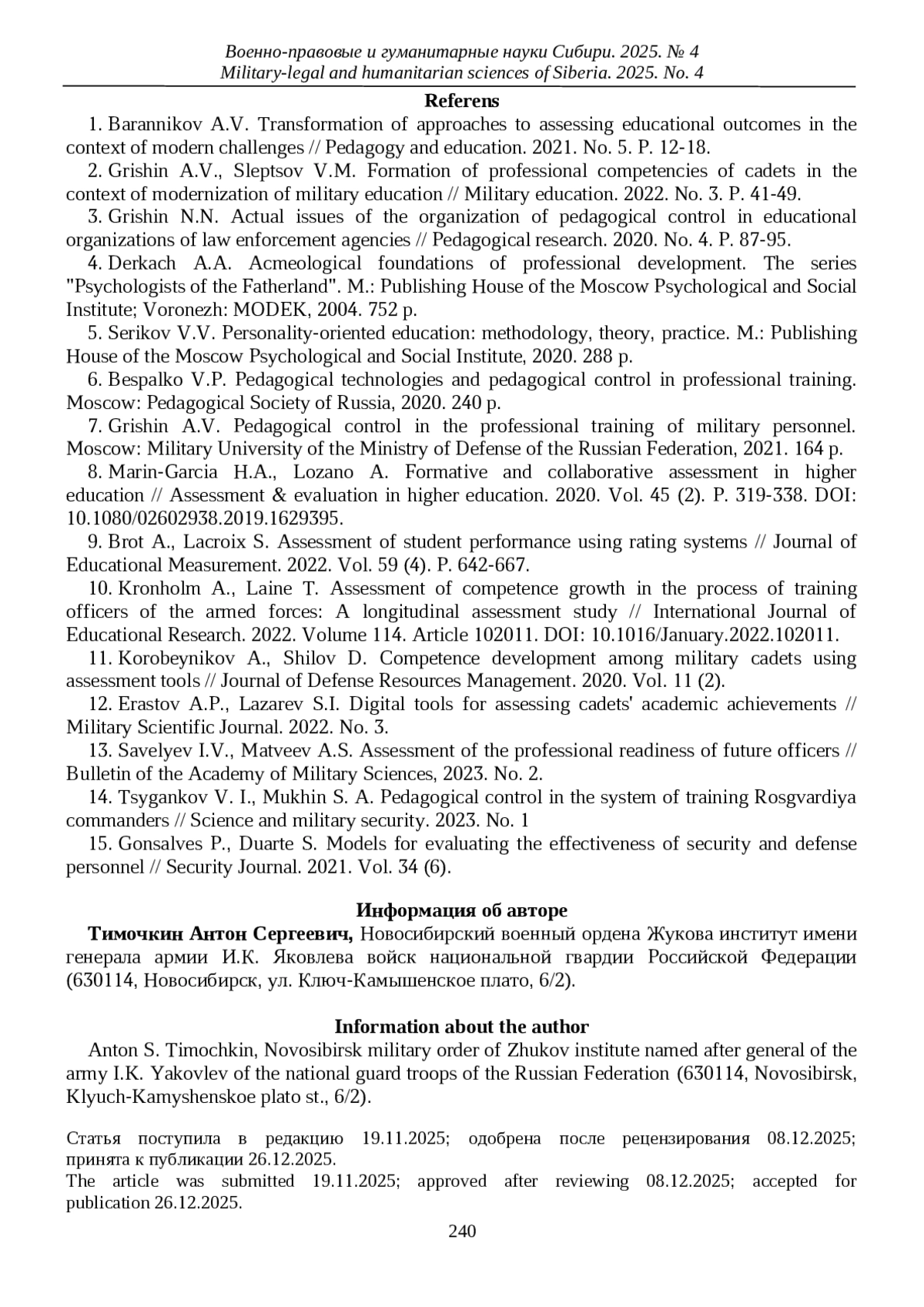 11. Korobeinikov A., Shilov D.Competency Development in Military Cadets Through Assessment Tools // Journal of Defense Resources Management. 2020. Vol. 11 (2).