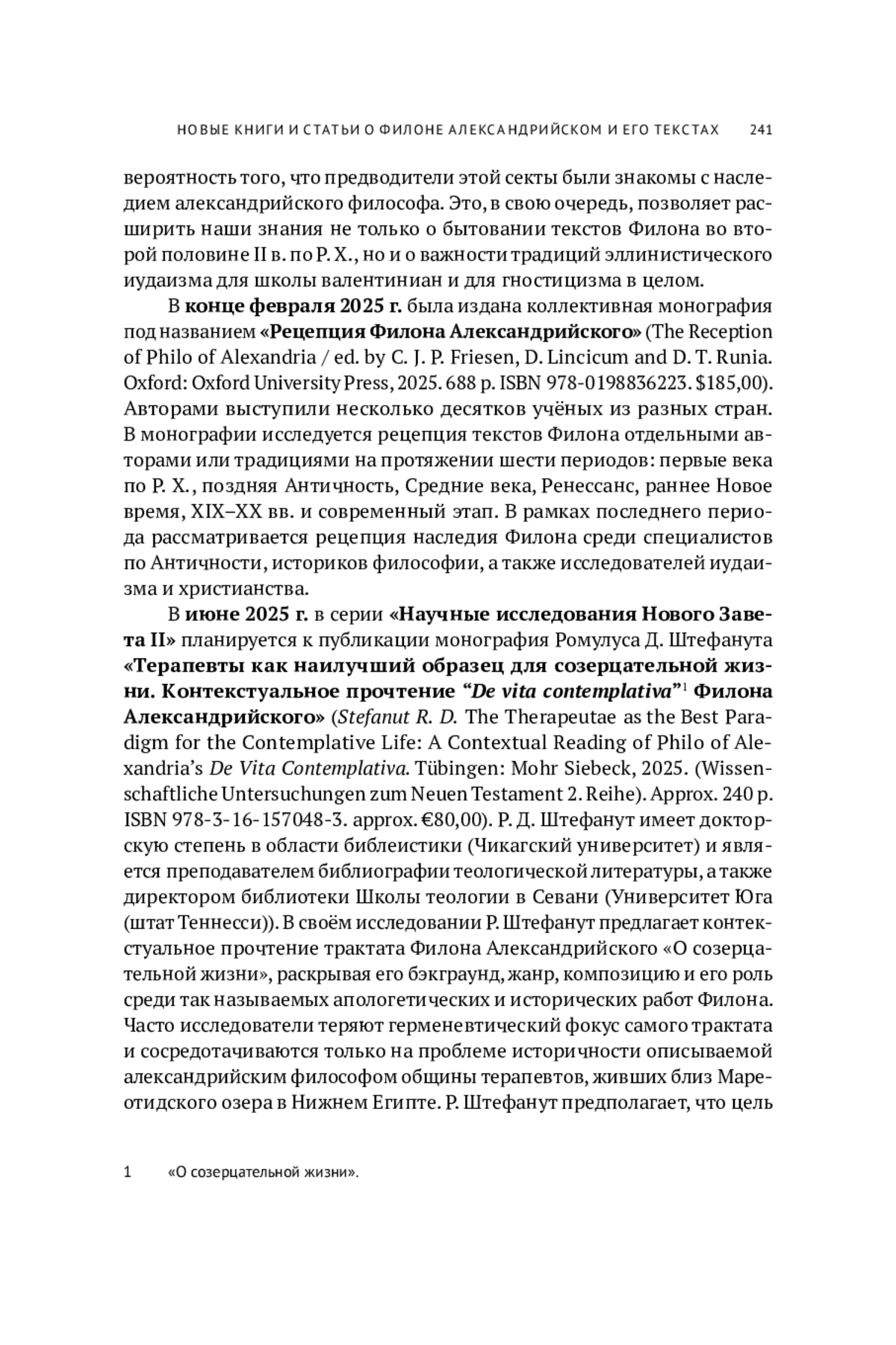 В июне 2024 г. в серии «Studia Philonica Monographs» была опубликована монография Ристо Овинена «Влияние Филона на традицию валентиниан» (Auvinen R. Philo’s Influence on Valentinian Tradition. Atlanta (Ga.): SBL Press, 2024. (Studia Philonica Monographs; vol. 10). 348 p. ISBN 978-1628375756. $79,00). Р. Овинен имеет степень доктора теологии (университет Хельсинки) и является приходским священником Лютеранской церкви Финляндии. В своей монографии он предлагает новый взгляд на отношения между экзегетическими и философскими традициями, содержащимися в трудах Филона и гностических текстах валентиниан, обращая особое внимание на последнюю половину II в. по Р. Х., ставшую важнейшим периодом для формирования этого гностического учения. Автор утверждает, что множество параллелей между текстами Филона и источниками валентиниан увеличивает вероятность того, что предводители этой секты были знакомы с наследием александрийского философа. Это, в свою очередь, позволяет расширить наши знания не только о бытовании текстов Филона во второй половине II в. по Р. Х., но и о важности традиций эллинистического иуда из ма для школы валентиниан и для гностицизма в целом.