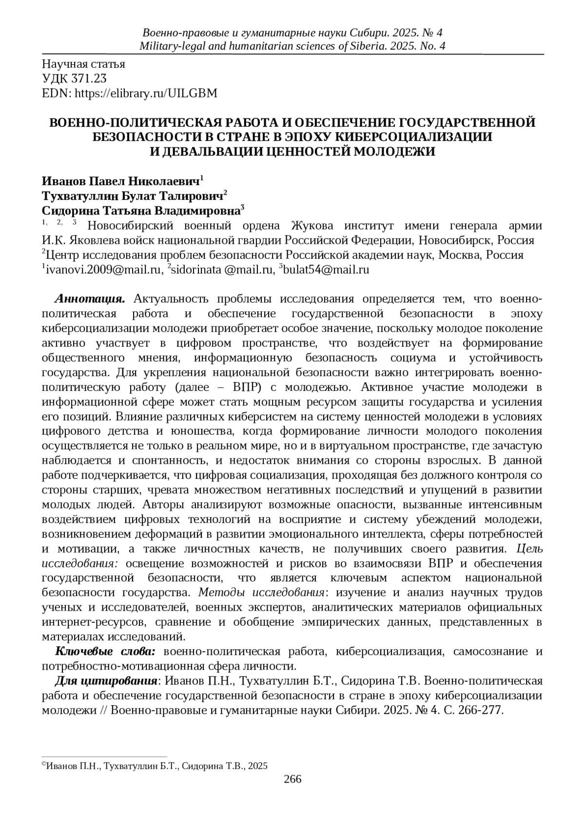 Актуальность проблемы исследования определяется тем, что военно-политическая работа и обеспечение государственной безопасности в эпоху киберсоциализации молодежи приобретает особое значение, поскольку молодое поколение активно участвует в цифровом пространстве, что воздействует на формирование общественного мнения, информационную безопасность социума и устойчивость государства. Для укрепления национальной безопасности важно интегрировать военно-политическую работу (далее - ВПР) с молодежью.