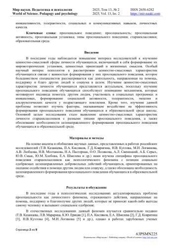 Основными методами рассмотрения проблемы исследования стали анализ и обобщение научных данных, представленных в психологической литературе в аспекте изучения особенностей просоциального поведения старшеклассников как психологического феномена, а также тестирование, позволившее выявить основные типы просоциального поведения старшеклассников. Проведенная диагностическая работа позволила сделать вывод о выраженной потребности в формировании у старшеклассников более глубокой социальной ответственности и эмпатии, направленной не только на публичные действия, но и на бескорыстную помощь другим людям. Это может способствовать развитию более сбалансированного и разнообразного просоциального поведения старшеклассников, что в конечном итоге положительно скажется на их социальной адаптации и взаимодействии в обществе. Необходимо и важно организовать образовательную среду, которая бы способствовала формированию просоциального поведения старшеклассников, создавая условия для формирования у них ценностно-смысловых ориентиров, социальной активности и инициативности, толерантности, социальных и коммуникативных навыков, личностных качеств.