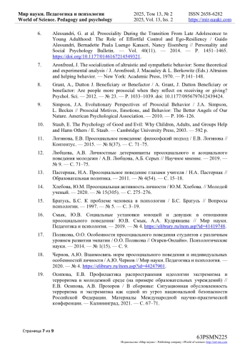 6. Alessandri, G. at al. Prosociality During the Transition From Late Adolescence to Young Adulthood: The Role of Effortful Control and Ego-Resiliency / Guido Alessandri, Bernadette Paula Luengo Kanacri, Nancy Eisenberg // Personality and Social Psychology Bulletin. - Vol. 40(11). - 2014. - P. 1451-1465. DOI: 10.1177/0146167214549321