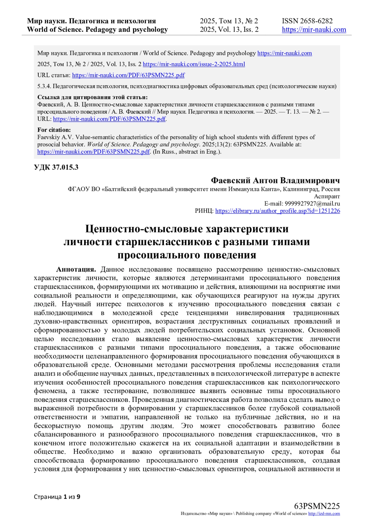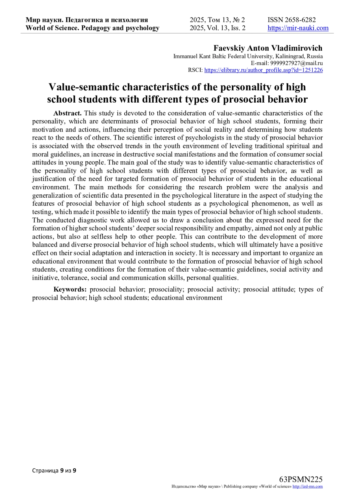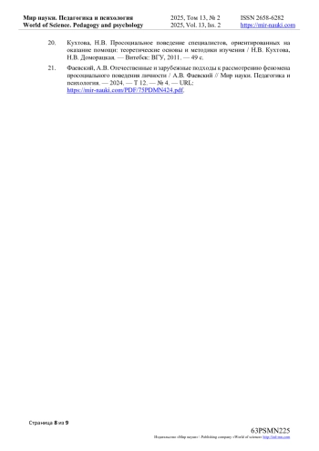21. Фаевский, А.В. Отечественные и зарубежные подходы к рассмотрению феномена просоциального поведения личности / А.В. Фаевский // Мир науки. Педагогика и психология. - 2024. - Т 12. - № 4. - URL: https://mir-nauki.com/PDF/75PDMN424.pdf. EDN: UGJMQQ
