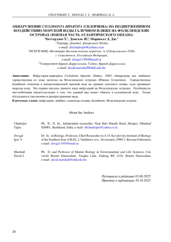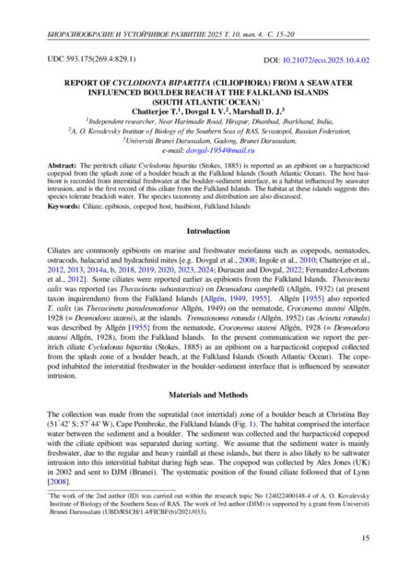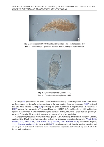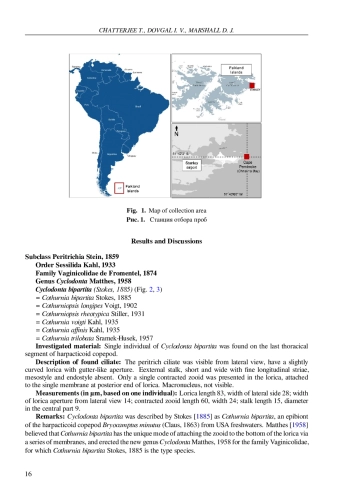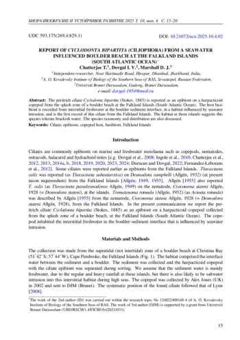 Инфузории обычно являются эпибионтами морской и пресноводной мейофауны, такими как веслоногие рачки, нематоды, остракоды, галакаридные и гидрахнидные клещи [например, Довгаль и др., 2008; Инголе и др., 2010; Чаттерджи и др., 2012, 2013, 2014a, b, 2018, 2019, 2020, 2023, 2024; Дурукан и Довгаль, 2022; Фернандес-Леборанс и др., 2012]. Ранее сообщалось о некоторых инфузориях как об эпибионтах Фолклендских островов. Thecacineta calix была обнаружена (как Thecacineta subantarctica) на Desmodora campbelli (Allgén, 1932) (в настоящее время таксон inquirendum) на Фолклендских островах [Allgén, 1949, 1955]. Allgén [1955] также сообщал T. calix (как Thecacineta paradesmodorae Allgén, 1949) на нематоде Croconema stateni Allgén, 1928 (= Desmodora stateni) на островах. Trematosoma rotunda (Allgén, 1952) (как Acineta rotunda) была описана Алленом [1955] на основе нематоды Croconema stateni Allgén, 1928 (= Desmodora stateni Allgén, 1928), обитающей на Фолклендских островах. В данной статье мы сообщаем о перитриховой инфузории Cyclodonta bipartita (Stokes, 1885) как об эпибионте гарпактикоидной копеподы, собранной в зоне прибоя на галечном пляже на Фолклендских островах (Южная Атлантика). Копепода обитала в пресноводном слое между галькой и донным грунтом, куда проникала морская вода.