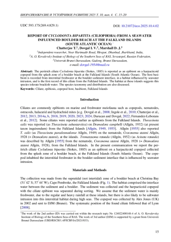 Ciliates are commonly epibionts on marine and freshwater meiofauna such as copepods, nematodes, ostracods, halacarid and hydrachnid mites [e. g. Dovgal et al., 2008; Ingole et al., 2010; Chatterjee et al., 2012, 2013, 2014a, b, 2018, 2019, 2020, 2023, 2024; Durucan and Dovgal, 2022; Fernandez-Leborans et al., 2012]. Some ciliates were reported earlier as epibionts from the Falkland Islands. Thecacineta calix was reported (as Thecacineta subantarctica) on Desmodora campbelli (Allgén, 1932) (at present taxon inquirendum) from the Falkland Islands [Allgén, 1949, 1955]. Allgén [1955] also reported T. calix (as Thecacineta paradesmodorae Allgén, 1949) on the nematode, Croconema stateni Allgén, 1928 (= Desmodora stateni), at the islands. Trematosoma rotunda (Allgén, 1952) (as Acineta rotunda) was described by Allgén [1955] from the nematode, Croconema stateni Allgén, 1928 (= Desmodora stateni Allgén, 1928), from the Falkland Islands. In the present communication we report the peritrich ciliate Cyclodonta bipartita (Stokes, 1885) as an epibiont on a harpacticoid copepod collected from the splash zone of a boulder beach, at the Falkland Islands (South Atlantic Ocean). The copepod inhabited the interstitial freshwater in the boulder-sediment interface that is influenced by seawater intrusion.