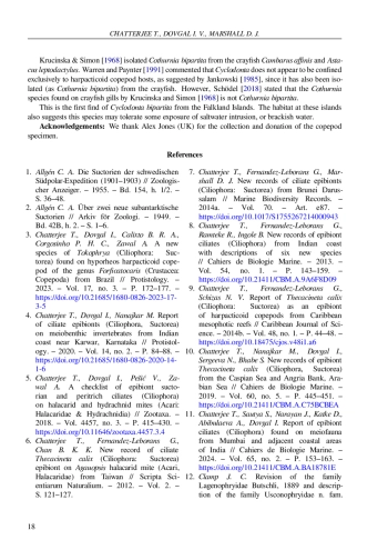 Чаттерджи Т., Фернандес-Леборанс Г., Рамтеке Р., Инголе Б. Новые записи инфузорий эпибионтов (Ciliophora) с побережья Индии с описаниями шести новых видов // Cahiers de Biologie Marine. - 2013. - т. 54, №. 1. - С. 143-159. -. DOI: 10.21411/куб.М.A.9A6F8D09