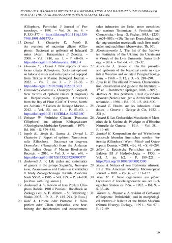 14. Durucan F., Dovgal I. New reports of suctorian ciliates (Ciliophora, Suctorea) epibiont on halacarid mites and an harpacticoid copepod from Türkiye // Marine Biological Journal. - 2022. - Vol. 7, no. 3. - P. 28-33. -. DOI: 10.21072/mbj.2022.07.3.03